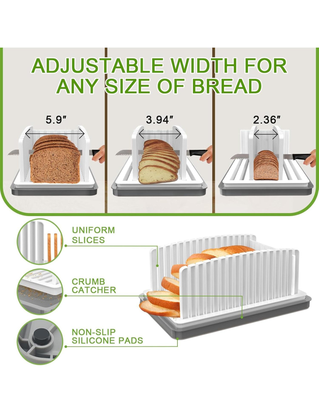 - BANDEJA MULTIFUNCIONAL INCLUIDA: La bandeja puede recoger migas de pan al cortar. Mantiene la cocina ordenada. También se puede usar como contenedor para pan, frutas, bocadillos y más. Alfombrilla antideslizante en la parte inferior de la bandeja para evitar cortes en la mano. Lavable y fácil de limpiar