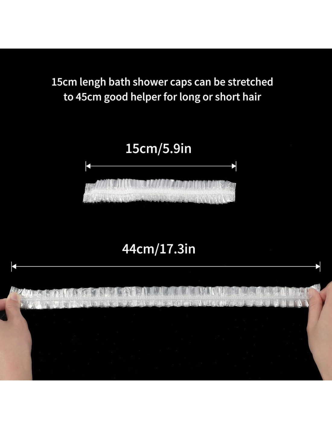 - [100PCS Gorras de Ducha Medianas] Estas son 100 gorras de ducha desechables, cada gorra de ducha mide aproximadamente 15 cm de largo cuando no está estirada y puede estirarse hasta aproximadamente 43.9 cm. Impermeables, a prueba de polvo, ligeras y duraderas para satisfacer tu uso diario.