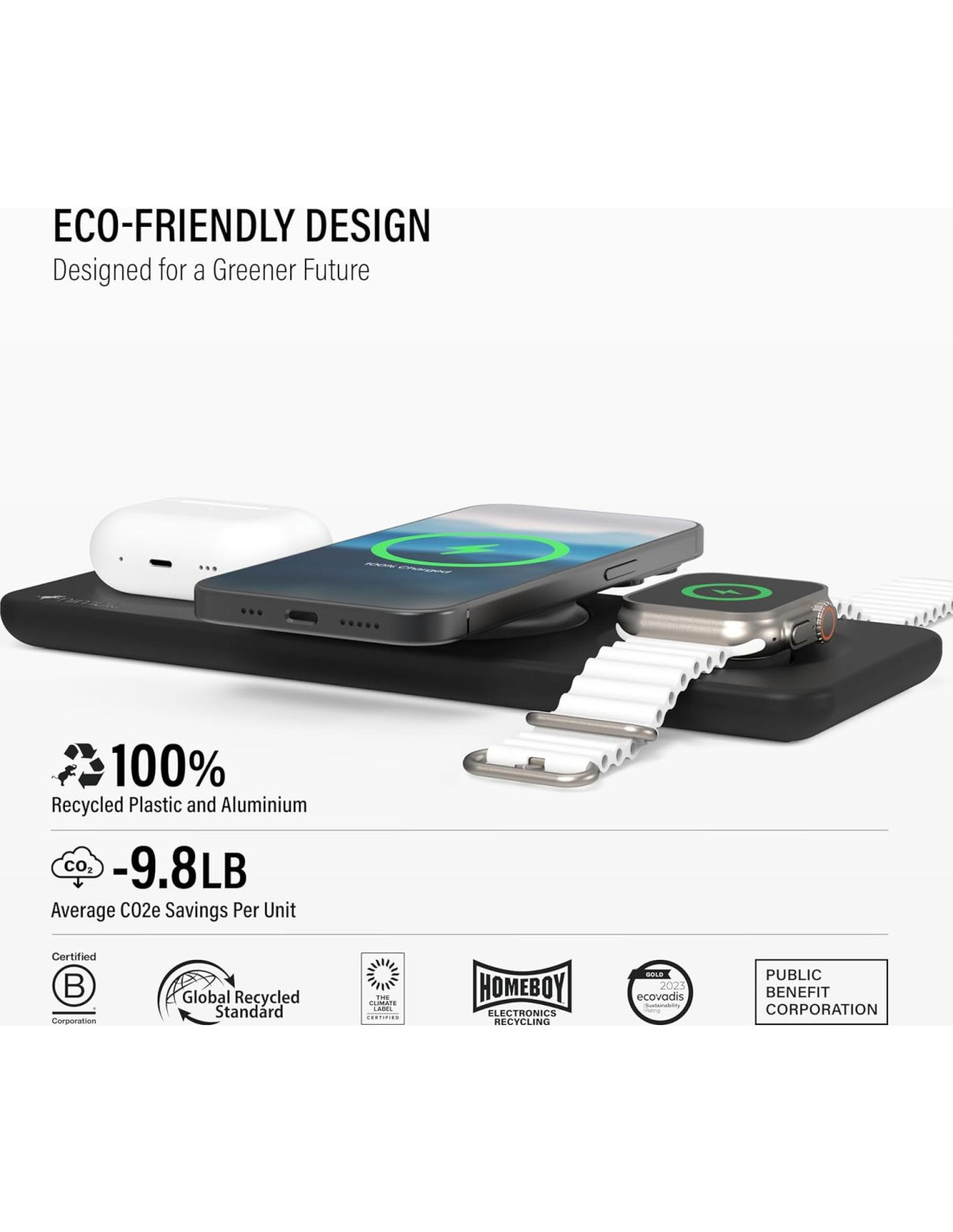 - Diseño Sostenible: Hecho de materiales reciclados certificados, esta estación de carga para reloj ayuda a reducir 4.45 kg de emisiones de CO2. Este soporte de carga para AirPods se envía en un empaque simple y plano e incluye una bolsa prepagada para reciclar dispositivos tecnológicos antiguos.