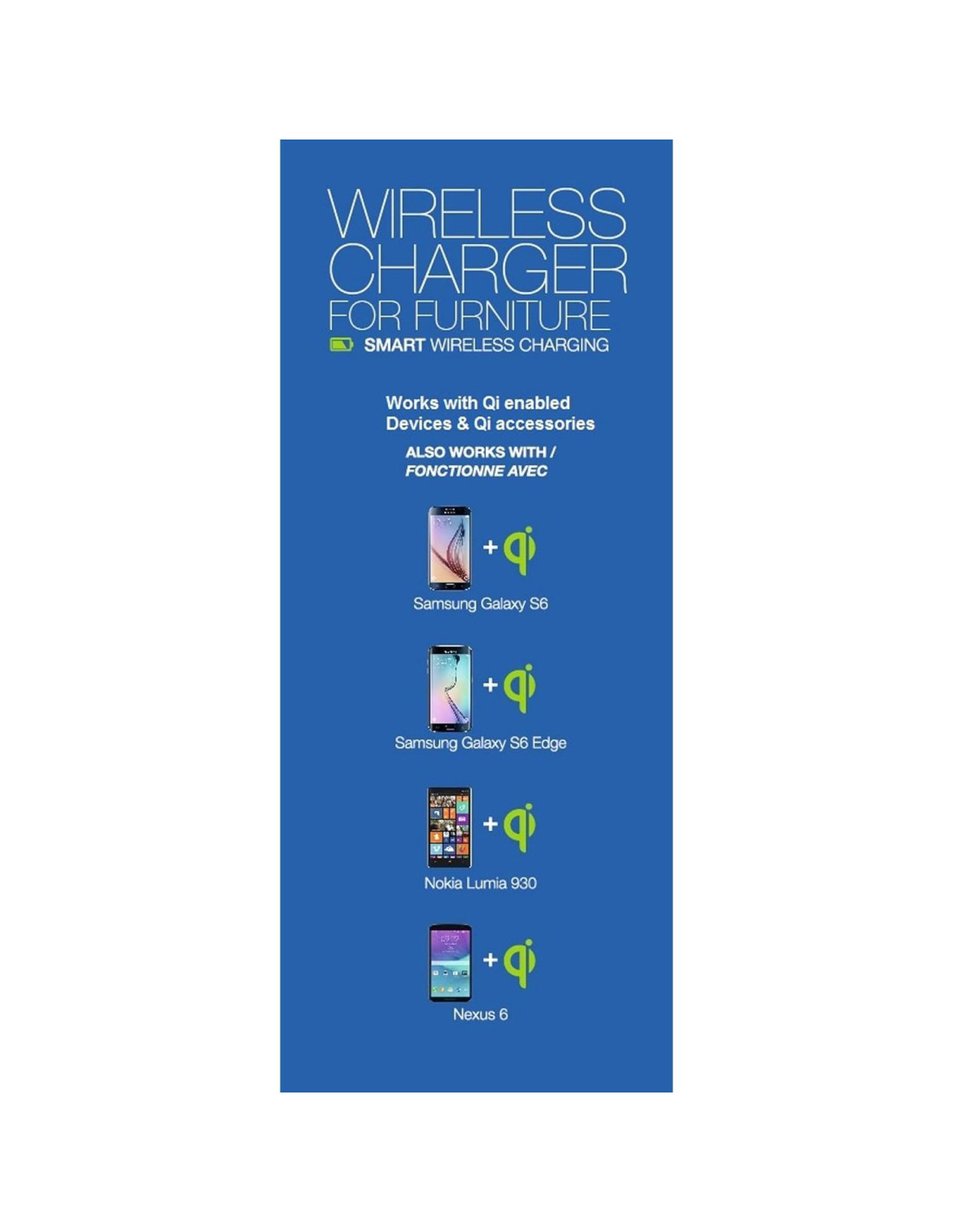 Admite ampliamente todos los dispositivos Qi RX. Nunca tendrás que buscar un cable para conectar tu teléfono y cargarlo, simplemente coloca tu dispositivo sobre la almohadilla de carga Air Energy de NTW y deja que haga el resto. Especificaciones: Módulo de carga Qi para muebles NTW Air Energy Entrada: 5V 1.8A Salida: 5V 1A Adaptador de corriente AC Entrada: AC 100-240v50-60hz 0.35A Máx Salida DC 5V 2A usa la almohadilla de carga Air Energy de NTW con dispositivos integrados Qi como: como us padfone S BlackBerry classic, Z30 (Verizon), Priv (solo EE. UU.) Cat S50 Dell Venue 8 fujitsu arrows f-09d, arrows Kiss f-03d, arrows Kiss f-03e, arrows x f-10d Google Nexus 4, Nexus 5, Nexus 6, Nexus 7 HP elite X3 (próximamente) HTC 8X (Verizon), droid DNA, Thunderbolt (Verizon) Kyocera Hydro elite, Torque, urbano L01, urbano L03 LG G2 (Verizon), G3, Lucid 2, Lucid 3, Optimus G Pro, spectrum 2 Microsoft Lumia 950, Lumia 950 XL M.t.t master Motorola Moto 360, Droid Maxx, Droid Mini, Droid Turbo, Moto Maxx solo EE. UU. Nokia Lumia 1020, Lumia 1520, Lumia 735, Lumia 830, Lumia 920, Lumia 928, Lumia 930 Panasonic eluga V p-06d, Panasonic eluga x p-02e Philips X723 Samsung Galaxy Note 5, Samsung Galaxy S6, Samsung Galaxy S6 edge, Samsung Galaxy S6 edge +, Samsung Galaxy S7, Samsung Galaxy S7 edge saygus V2 Sony nsp 10, Xperia z3v, Xperia z4v techdy basic Bear vertu signature touch, Aster yotaphone 2 para dispositivos como Apple iPhone 4, iPhone 4S, iPhone 5, iPhone 5S, iPhone 6, iPhone 6S, I Pads, y todos los demás teléfonos inteligentes y tabletas, por favor usa accesorios Qi para habilitar la carga inalámbrica. Hay una amplia variedad de accesorios Qi disponibles en el mercado como - Receptor de carga inalámbrica Qi - Funda de carga inalámbrica Qi - Adaptadores USB Qi - encuentra el que se adapte a tu dispositivo. Preguntas no dudes en contactarnos [email protected] o 732-355-1288 Contenido del paquete: Módulo de carga Qi para muebles NTW Air Energy X1 Cable de carga USB a DC 2.5 X1 Adaptador de corriente AC X1 Manual del usuario X1 tornillo X3 broca de sierra de 62mm X1