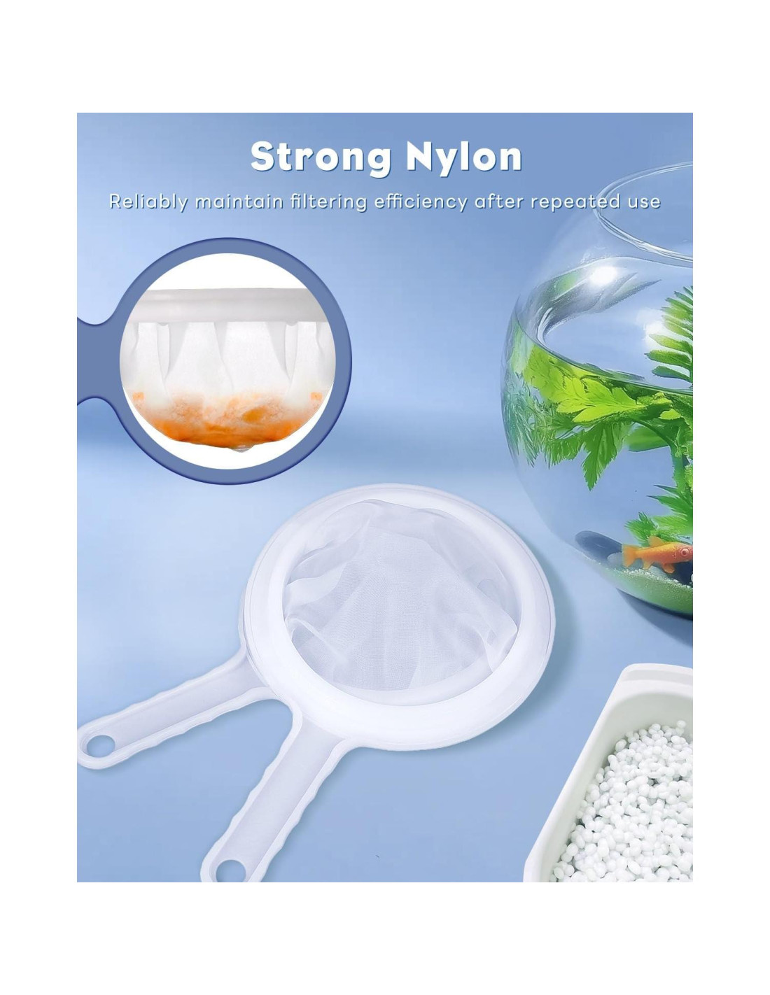 - Malla de Nailon Fina: La red bien cosida está hecha de nailon suave pero resistente. Mantiene de manera confiable la eficiencia de filtración a través del uso repetido. Agujeros densos del tamaño de una aguja capturan efectivamente cualquier nauplio pequeño. Cuanto más finos sean los agujeros, más blanca será la red