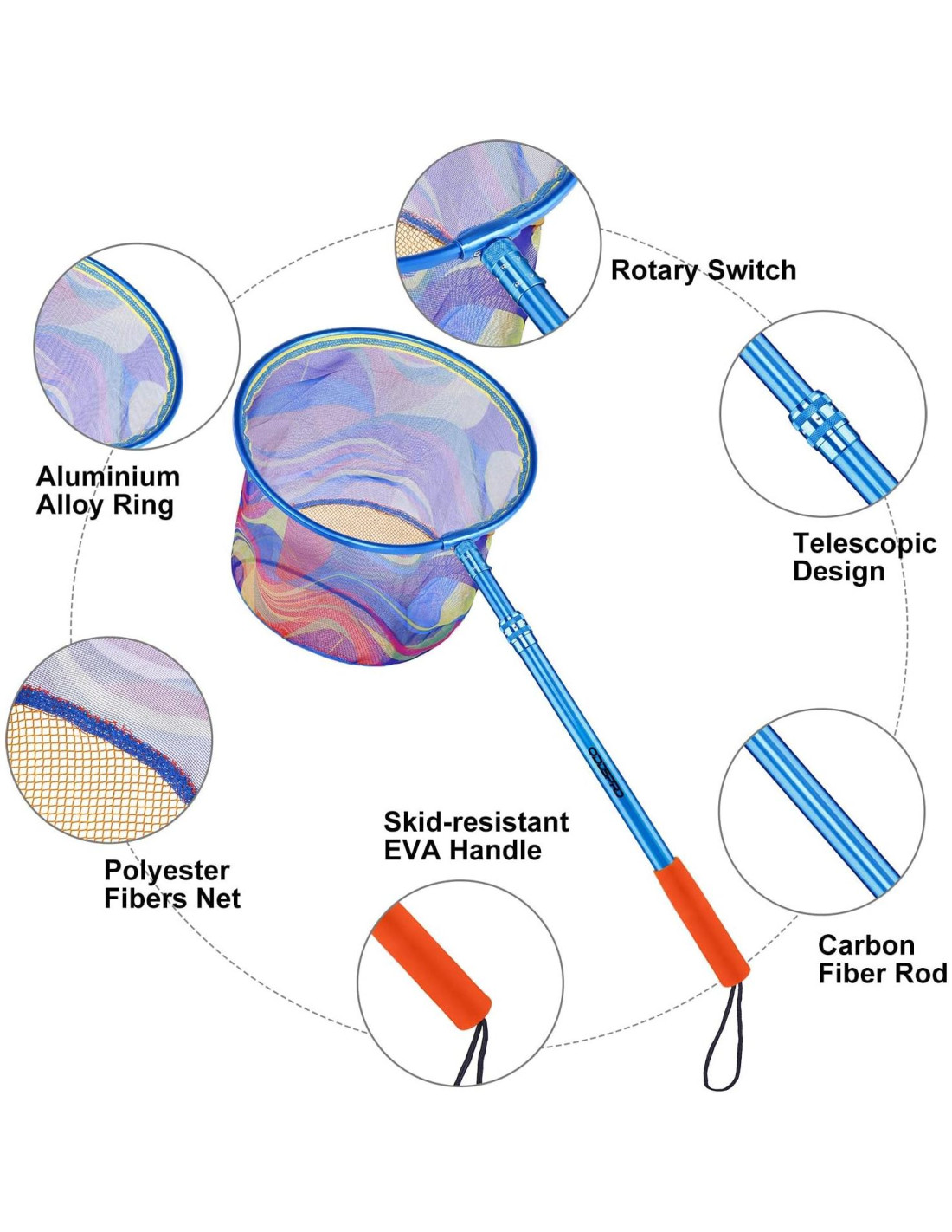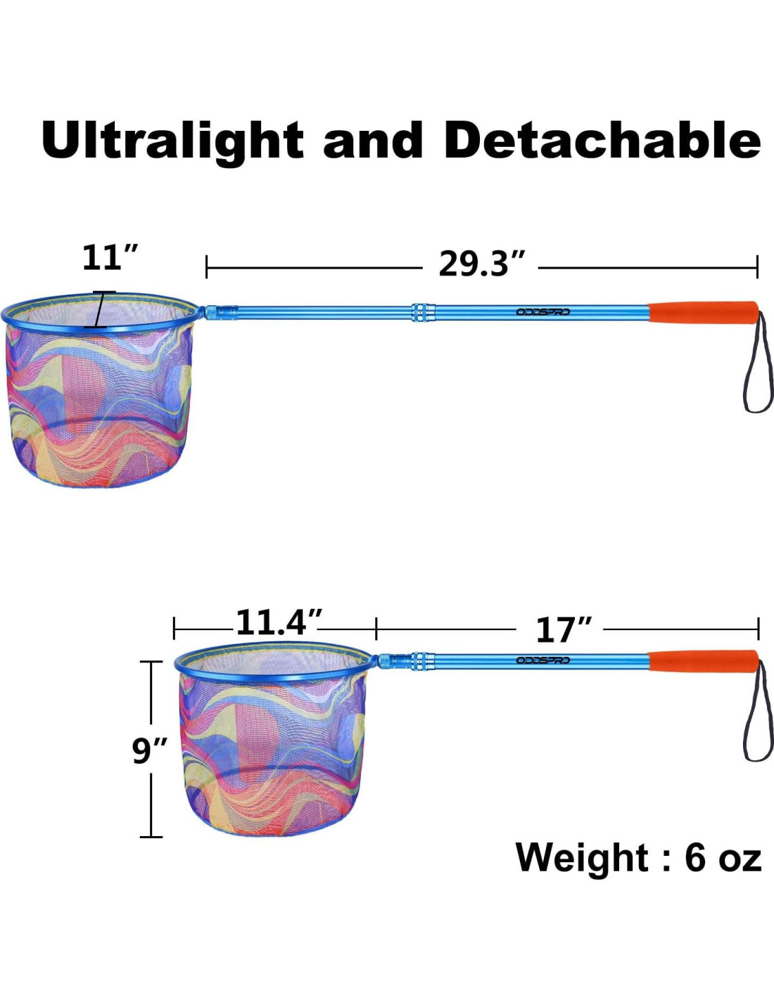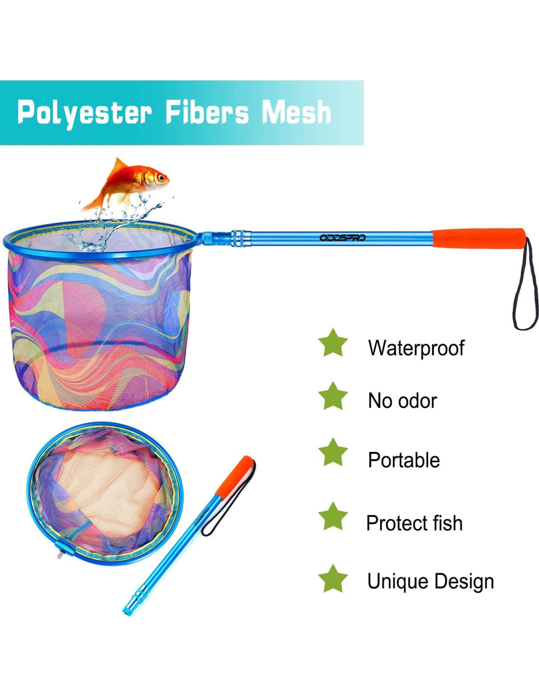 Comienza tu aventura de pesca aquí. Más diversión de pesca con los niños de ODDSPRO. ¡La pesca es una gran actividad para los niños! ¿Te gustaría encontrar una red de pesca más profesional para tus hijos? Con material de nylon resistente a desgarros y no absorbente, la red no se volverá pesada con agua, facilitando que los niños pesquen más fácilmente. La red de pesca de colores especialmente diseñada estimulará el interés de tus hijos por la naturaleza. Y el mango y el anillo de la red de aluminio hacen que la red de pesca sea ligera y fácil de llevar. El diseño que ahorra espacio del mango extensible facilitará su almacenamiento. No solo para pescar, la red de pesca también puede atrapar mariposas, libélulas y ranas.