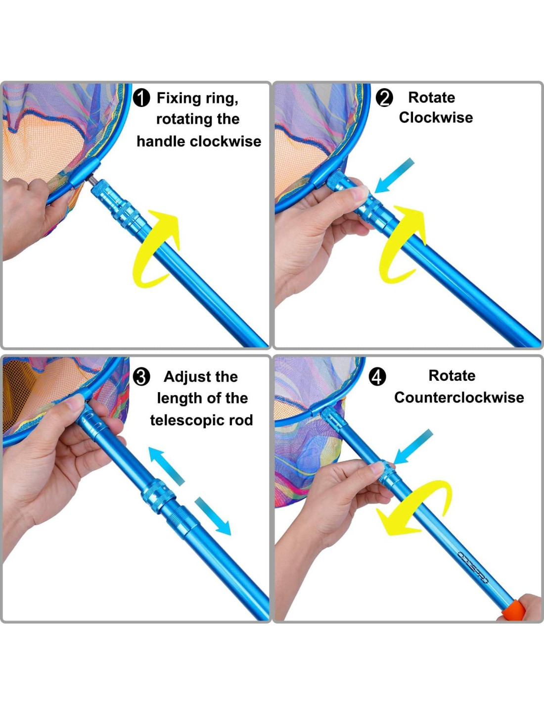- Dimensiones de la Red: Apertura de la red 12.2 pulgadas (31 cm) (L) x 10.8 pulgadas (27.4 cm) (W), profundidad de la red 11.4 pulgadas (29 cm). La longitud total se puede extender de 29.2 pulgadas (74 cm) a 42.2 pulgadas (107 cm) ya que puedes ajustar el mango del poste para satisfacer las necesidades del niño.