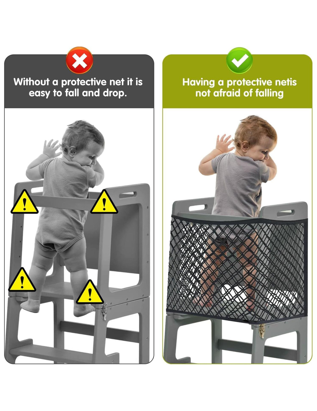 - Hebillas Ajustables: La hebilla ajustable permite que la red grande se ajuste a la mayoría de las torres de cocina para niños en el mercado, y se puede ajustar según el tamaño de la torre.