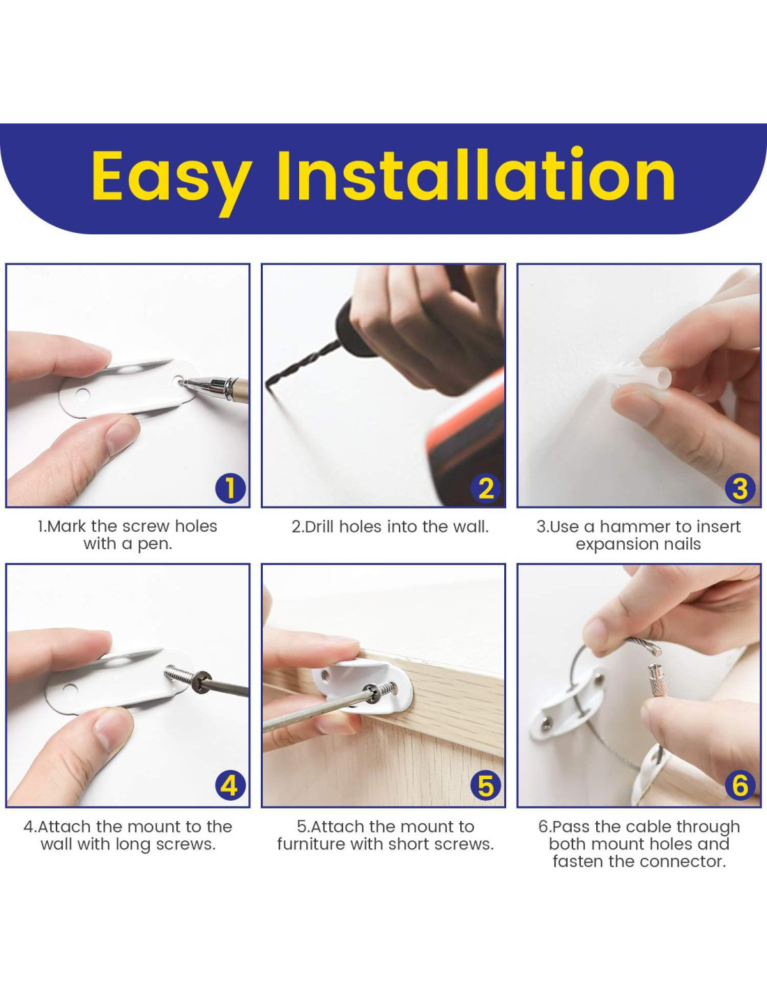 - FÁCIL DE INSTALAR: Usar un destornillador y un taladro puede instalar rápidamente los anclajes de muebles antivuelco en minutos. El kit de seguridad a prueba de bebés incluye todo el hardware necesario y soporta montaje vertical u horizontal para diferentes muebles;