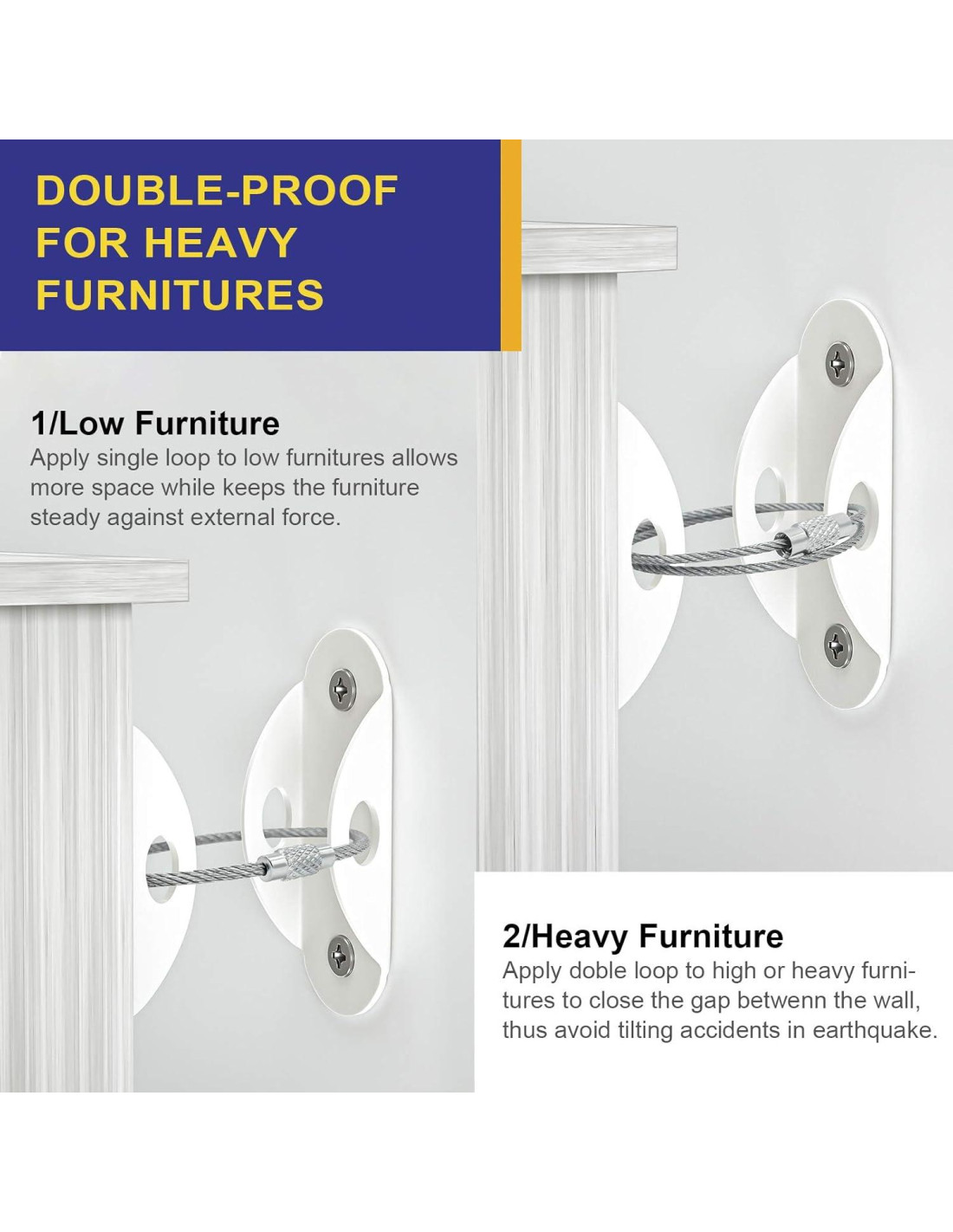 - AMPLIA APLICACIÓN: Los anclajes antivuelco para la pared son ideales para asegurar estanterías, cómodas, gabinetes y armarios. Desmontables para facilitar la limpieza o el movimiento de los muebles. Revisar y ajustar regularmente los anclajes de pared para mantener la seguridad a medida que los niños crecen;