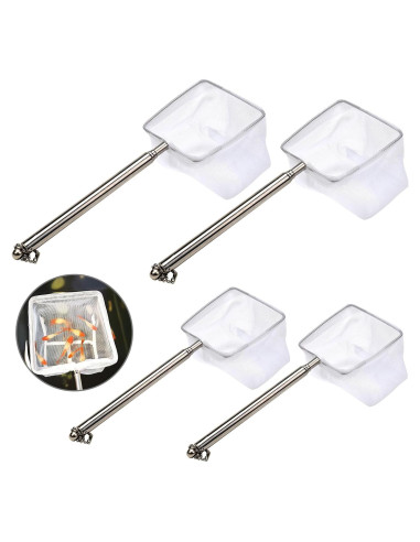 - Longitud Ajustable: Los mangos de acero inoxidable de estas 4 redes de camarones se ajustan de 13 a 39 cm para un uso versátil. Esta red para alevines está diseñada para ser rígida y resistente a la deformación o al óxido. La pequeña red para acuarios incluye un mango extensible, permitiéndote acceder a áreas profundas de tu acuario mientras mantienes las manos secas.