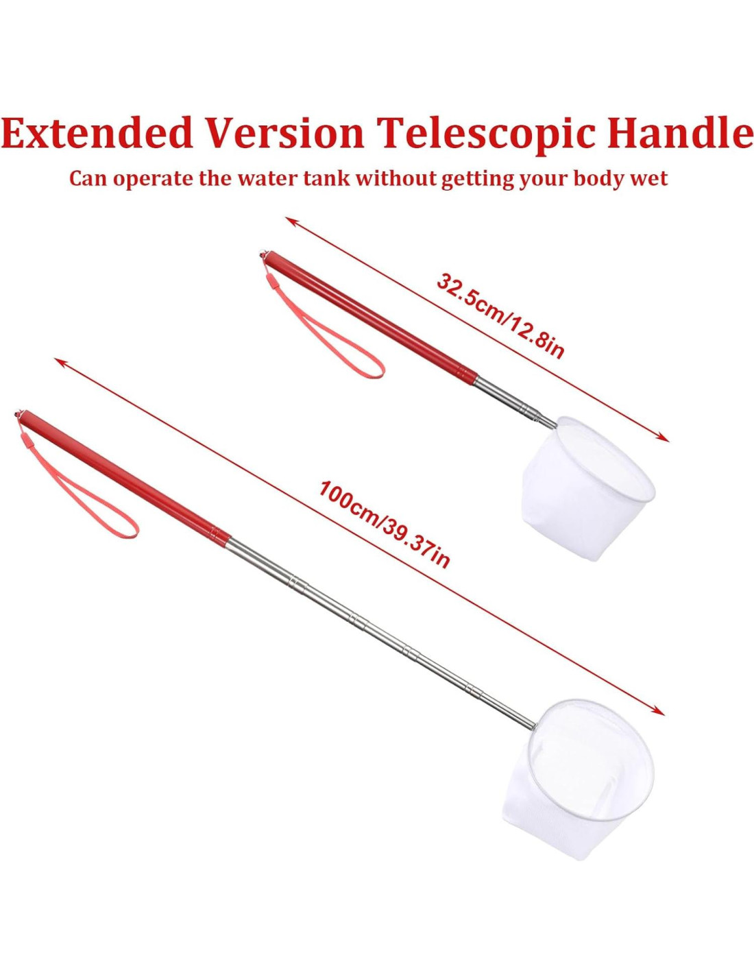 - [Mango Extensible] Esta red para peces de acuario cuenta con un mango telescópico y se puede ajustar de 8.6" a 39" (21.8 cm a 99.1 cm) de longitud, brindando a los usuarios la flexibilidad para adaptarse a diversas profundidades de acuario. El diseño práctico incluye un mango cómodo y antideslizante y una correa para colgar para un fácil almacenamiento