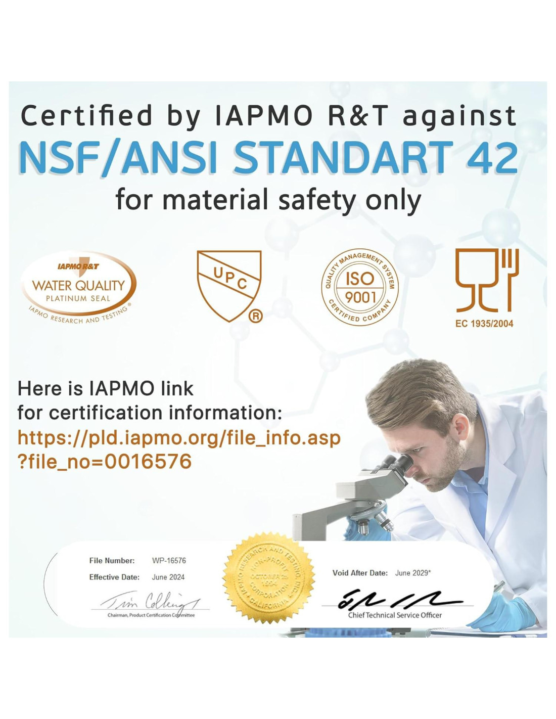 - SEGURIDAD CERTIFICADA Estos cartuchos son probados y certificados por IAPMO R&T contra el estándar NSF/ANSI 42 para seguridad de materiales, asegurando que cumplen con los más altos estándares de seguridad. Hechos de polipropileno 100% de grado alimenticio, cuentan con una tecnología única de fusión que previene la creación de desprendimiento de fibras, eliminando cualquier riesgo de re-contaminación del agua. Diseñados para un rendimiento duradero, estos filtros ofrecen una filtración confiable y eficiente para toda la casa, manteniendo la pureza del agua.