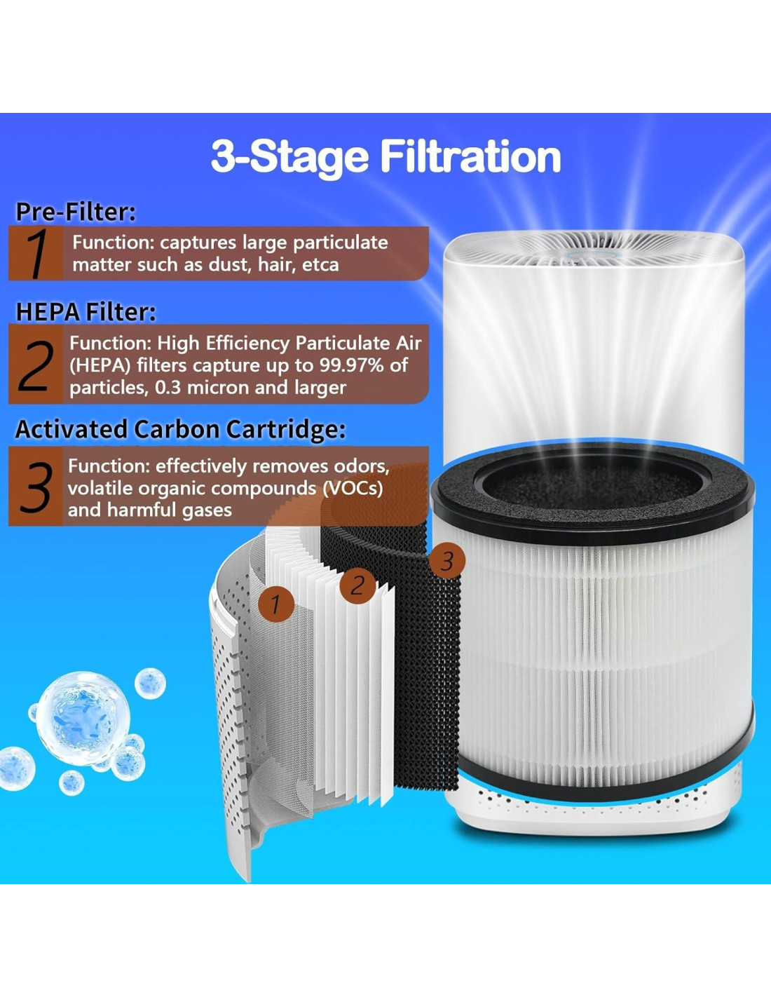 - [Sistema de Filtración de Múltiples Capas]: El cartucho del purificador de aire tiene un diseño de múltiples capas que incluye una capa de pre-filtración, una capa de filtración HEPA y una capa de carbón activado. La capa de pre-filtración captura partículas más grandes y extiende la vida útil de la capa de filtro HEPA, mientras que la capa de carbón activado elimina olores y gases nocivos para asegurar aire fresco.