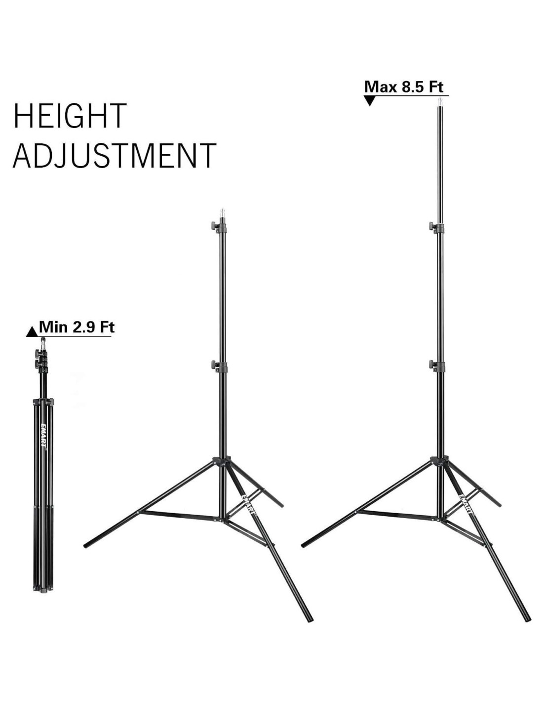 - Soporte de luz profesional hecho de construcción de aleación de aluminio para durabilidad, Ajustable de 2.9 pies (88.9cm) a 8.5 pies (260cm), capacidad de carga máxima: 22lb (9.98kg), Montaje estándar de soporte de luz para uso con cualquier cabezal de luz, Punta de tornillo de 1/4" en el vástago que soporta todo el equipo fotográfico como softbox, reflector, paraguas.