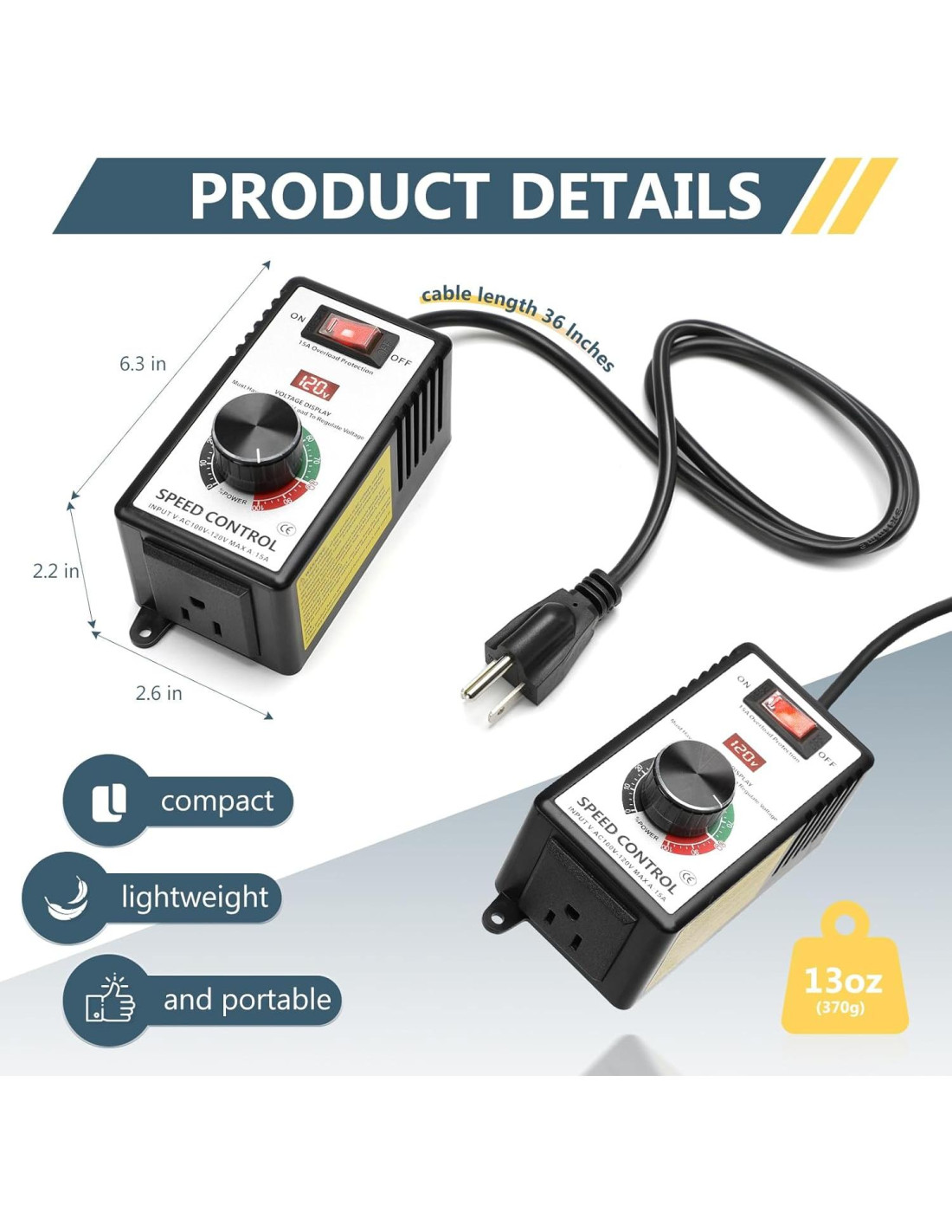- ESCENARIOS AMPLIAMENTE APLICABLES: el controlador de velocidad de motor 120V es adecuado para ventiladores eléctricos, extractores, amoladoras angulares, sopladores, taladros AC, lámparas incandescentes, hervidores y calefactores eléctricos. Nota: no se puede usar para electrodomésticos con placas de circuito y componentes electrónicos de capacitor, como hornos de microondas, cocinas de inducción, arroceras, bombas de agua, lavadoras, lámparas LED de ahorro de energía (productos con placas de circuito y componentes electrónicos de capacitor no se pueden usar)