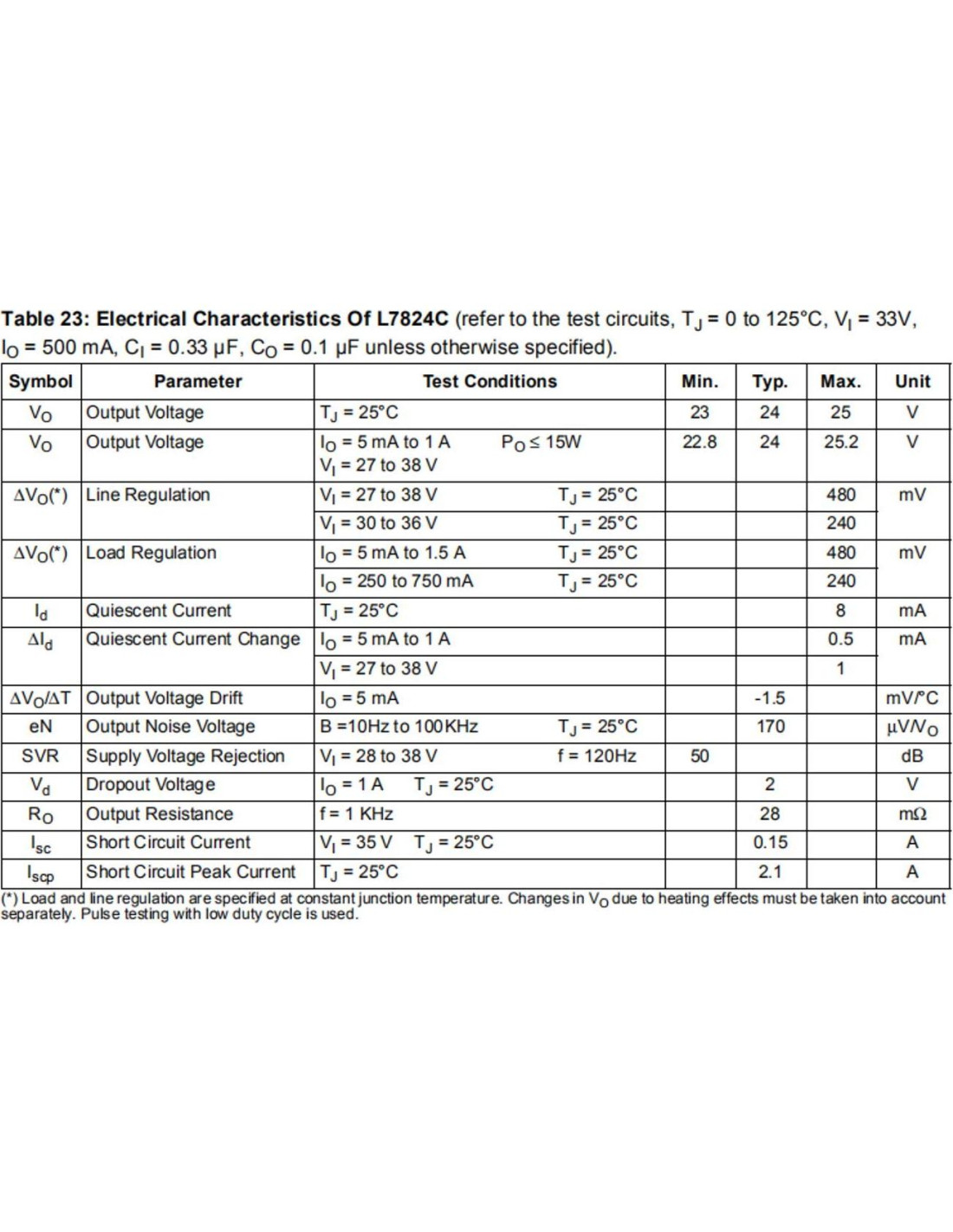 El L7824cv de reguladores positivos de tres terminales está disponible en paquetes TO-220 y varios voltajes de salida fijos, lo que lo hace útil en una amplia gama de aplicaciones. Cada tipo incorpora limitación de corriente interna, apagado térmico y protección de área segura, lo que lo hace esencialmente indestructible. Si se proporciona un enfriamiento adecuado, pueden entregar más de 1 A de corriente de salida. Aunque están diseñados principalmente como reguladores de voltaje fijos, estos dispositivos se pueden usar con componentes externos para obtener voltajes y corrientes ajustables. Voltaje de Salida Fijo Nom.: 24V Voltaje de Entrada Mín: 33V Voltaje de Entrada Máx: 40V Corriente de Salida: 1.5A Estilo de Caja del Regulador Lineal: TO-220 Temperatura de Operación Mín: 0C Temperatura de Operación Máx: 125C Paquete incluye: 10pcs* L7824CV