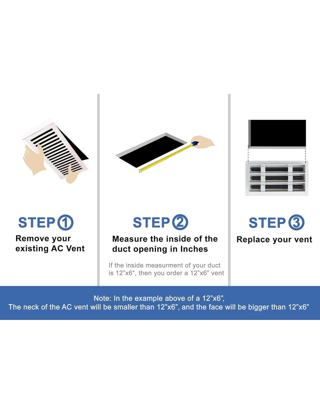 - El tamaño que necesitas saber para comprar esta cubierta de ventilación, o cualquier otra cubierta de ventilación, es midiendo la apertura del conducto de aire (la apertura de la caja de plenum) y no el tamaño de la cara o la cubierta de ventilación. Recomendamos que retires la antigua cubierta de ventilación de aire y midas el tamaño de la apertura del conducto de aire. No necesitas tener en cuenta el tamaño de la cara de la cubierta de ventilación. La medida importante es el tamaño de la apertura del conducto interior. Ejemplo: Un tamaño de cubierta de ventilación tradicional puede tener un tamaño de cara de 14x8, y un cuello de un poco menos de 12x6. Tu apertura del conducto de aire debería medir 12x6, así que compras un 12x6. Las dimensiones de la cubierta de ventilación se categorizan por el cuello y no por la cara de la cubierta de ventilación de aire.