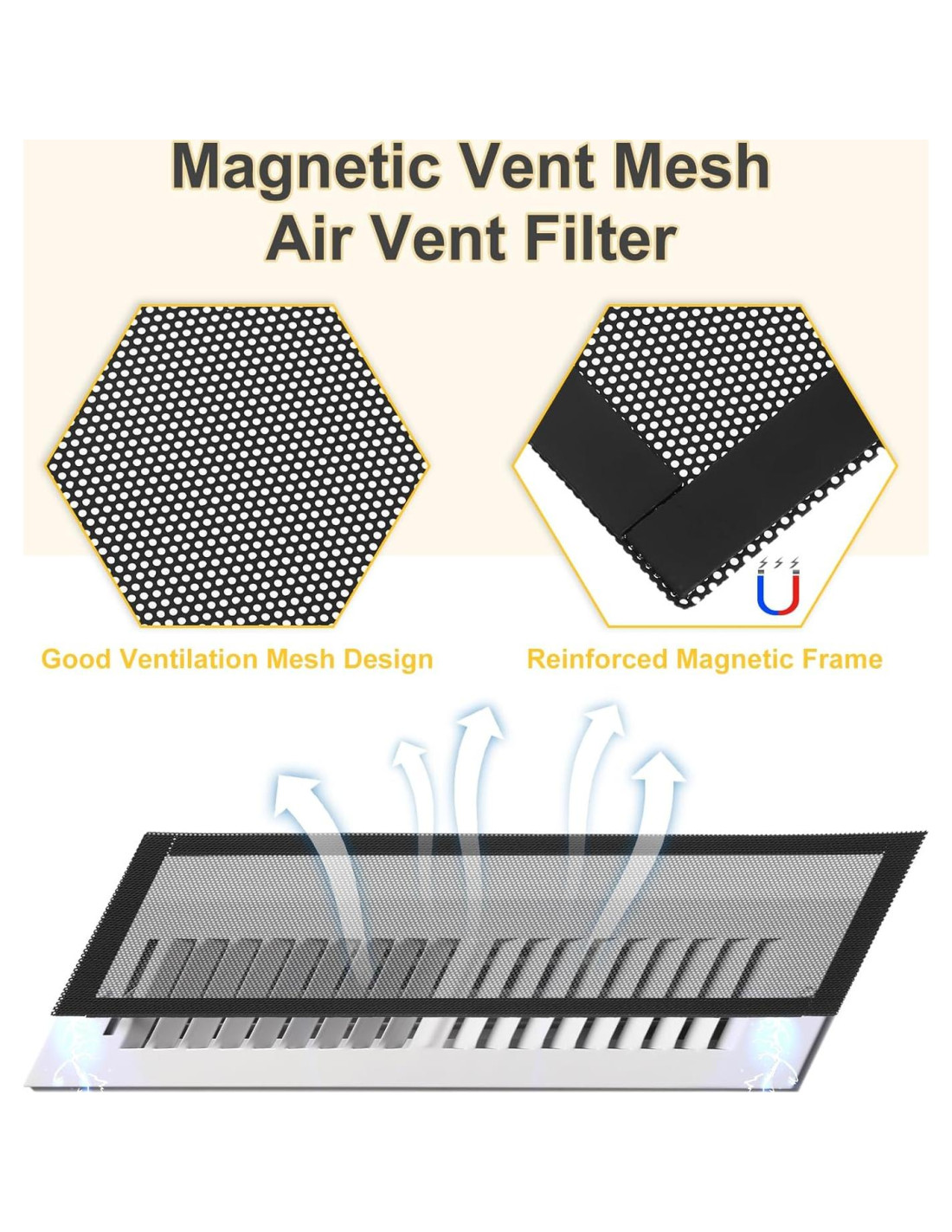 Material - La malla de pantalla de ventilación magnética está hecha de plástico y nailon, que es pequeña y ligera, duradera y resistente al desgaste, transpirable y práctica, y se puede combinar con varios estilos de decoración del hogar. Filtración y Adsorción - La cubierta de ventilación presenta un diseño de rejilla distribuida uniformemente, que puede prevenir eficazmente que pequeños objetos como escombros, cabello, juguetes, etc. caigan en la ventilación, ayudando a refrescar el aire y reduciendo la posibilidad de humedad. El imán le da una fuerte fuerza de adsorción, que puede fijarse firmemente después de la instalación, y no se desliza ni cae fácilmente, asegurando una ventilación suave. Fácil de Usar - Instalación fácil y rápida, no se requieren herramientas adicionales. La pantalla de registro de ventilación de piso presenta un diseño de borde magnético, solo necesita colocarla sobre la cubierta de ventilación del piso, y se adherirá firmemente a la superficie metálica. También puede quitarla fácilmente para limpiarla, y se puede reutilizar. Ampliamente Aplicable - La malla del filtro de ventilación de aire se puede usar en el dormitorio, sala de estar, cocina, oficina u otros lugares de flujo de aire, adecuada para varios tipos de ventilación, como ventilaciones de piso del hogar, cubiertas de ventilación de vehículos recreativos, gabinetes de estufas de cocina, etc.
