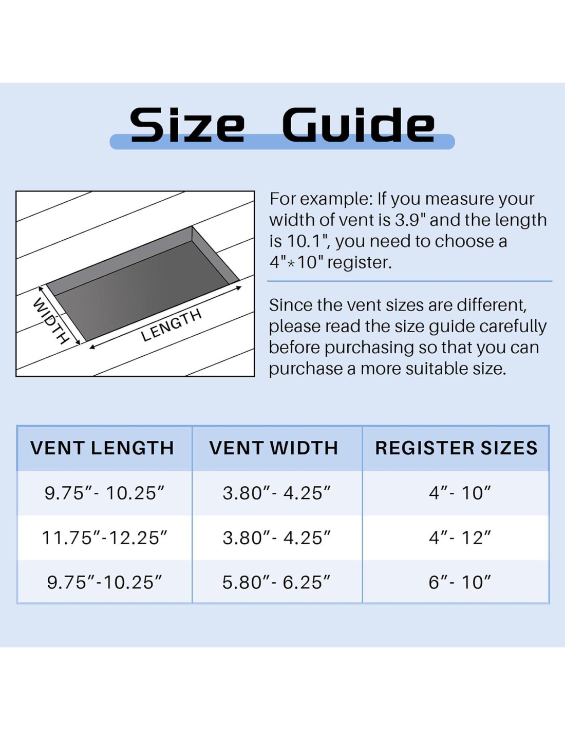 - Tamaño de la Cubierta de Ventilación: el deflector de ventilación de aire de 2 vías presenta una abertura de conducto que mide 25.4 cm x 10.16 cm, y se puede aplicar para montaje en pared o techo; La dimensión total mide 29.85 x 14.61 cm; Verifica el tamaño de tu conducto antes de comprar; El registro de techo es de diseño de 2 vías, el aire puede salir en 3 direcciones diferentes; Con botón de ajuste manual, presiona el botón hacia arriba o hacia abajo para obtener el volumen de aire deseado