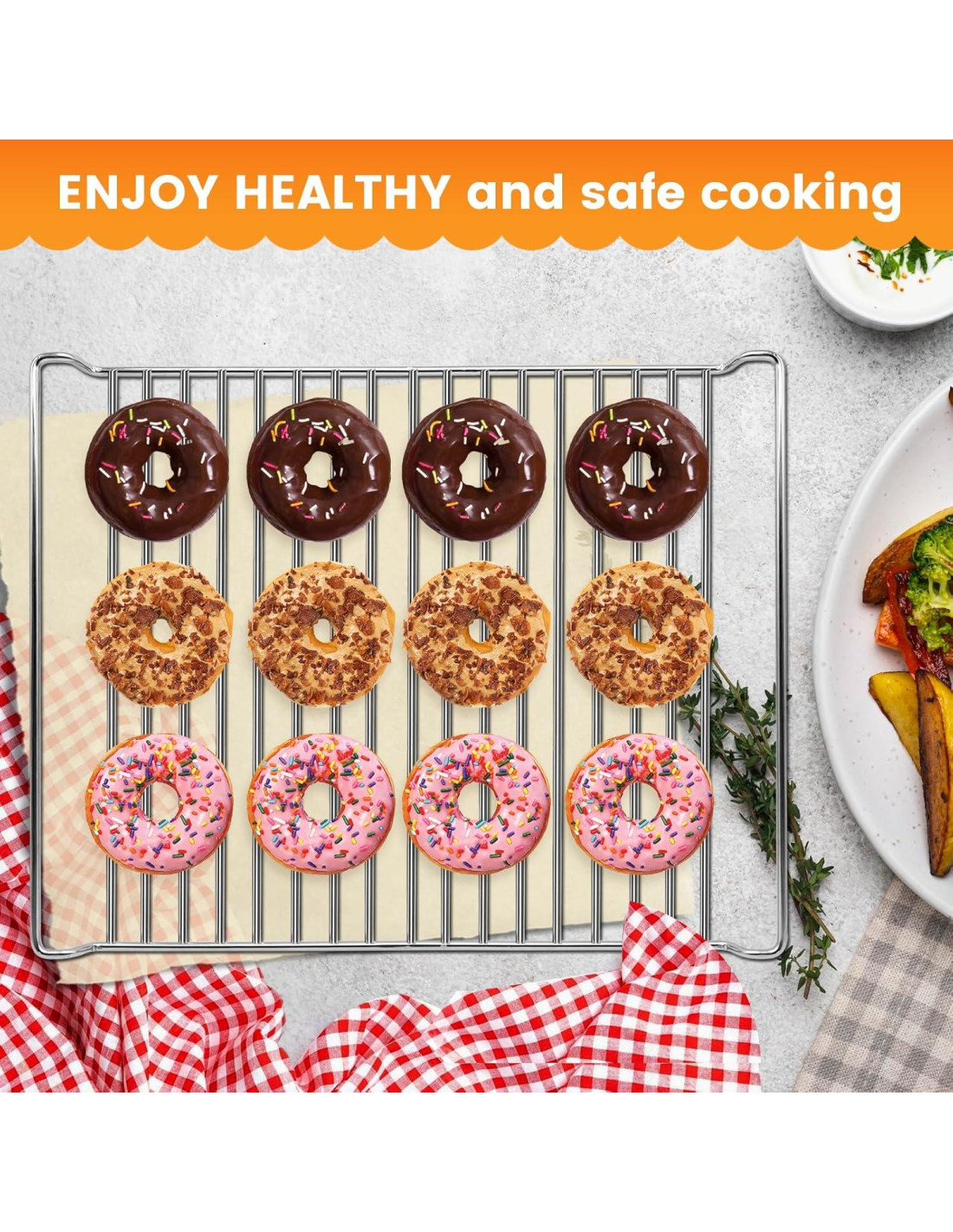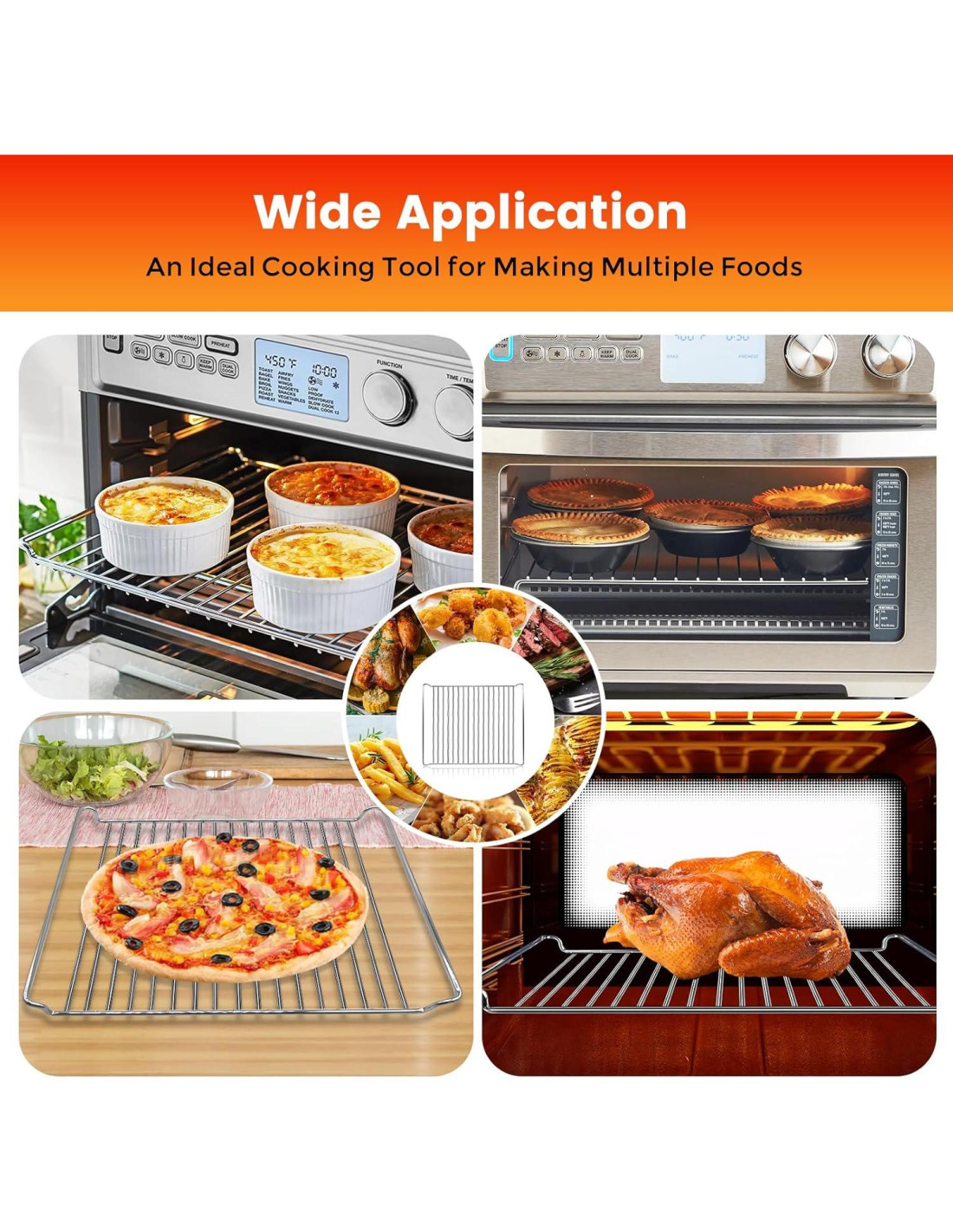 - [Amplia Aplicación] La rejilla para hornear es perfecta para cocinar y hornear en horno. Ideal para cocinar pollo, tocino, pescado, alitas de pollo, albóndigas, carne, verduras, papas, galletas, pasteles, etc. También se puede usar como cesta para asar para colocar frutas, verduras, utensilios de mesa y tazas. Es adecuada como regalo para amigos y familiares en fiestas. Usando la cesta crujiente incluida, puedes disfrutar de tus alimentos fritos favoritos sin exceso de aceite o grasa, lo que te proporciona una dieta más saludable.