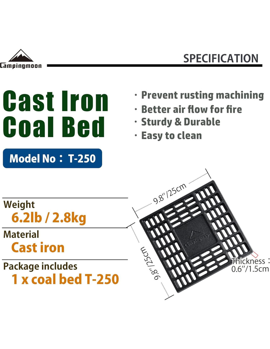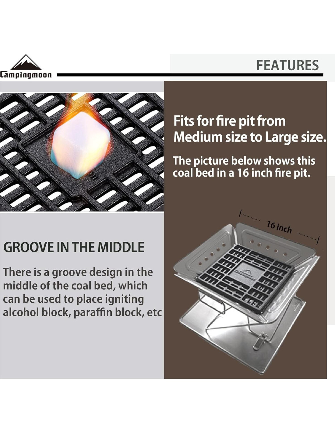 - Diseño Eficiente de Parrilla de Carbón: El diseño de orificios en el lecho de carbón favorece la ventilación y asegura suficiente oxígeno para la combustión del carbón y la leña. Esta rejilla de carbón de CAMPINGMOON se puede usar con fuegos de carbón o para fuegos de madera.