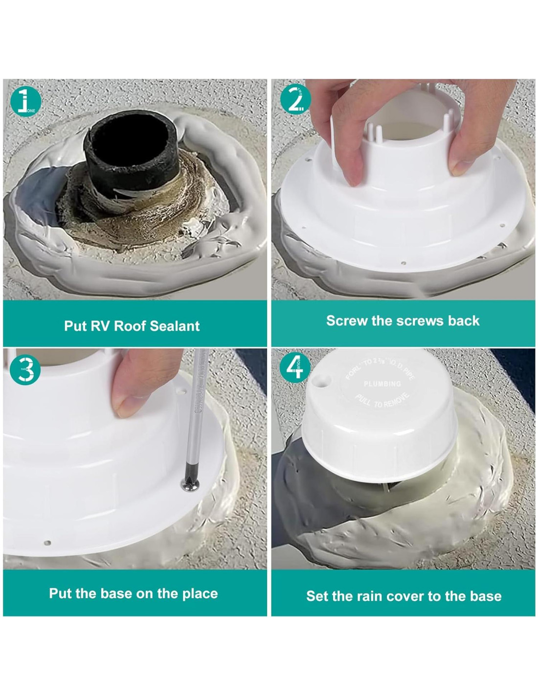 - Fácil de instalar - Retire la ventilación de fontanería dañada del tubo de ventilación de su RV, atornille directamente la tapa de ventilación de fontanería RV mediante 6 orificios de tornillo en la base para montaje, asegúrese de usar sellador para este trabajo, selle todo alrededor de la tapa de ventilación, para mantener el agua fuera después del reemplazo. Nota: Se ajusta a tubo de 1" (2.5 cm) a 2-3/8" (6 cm) de diámetro