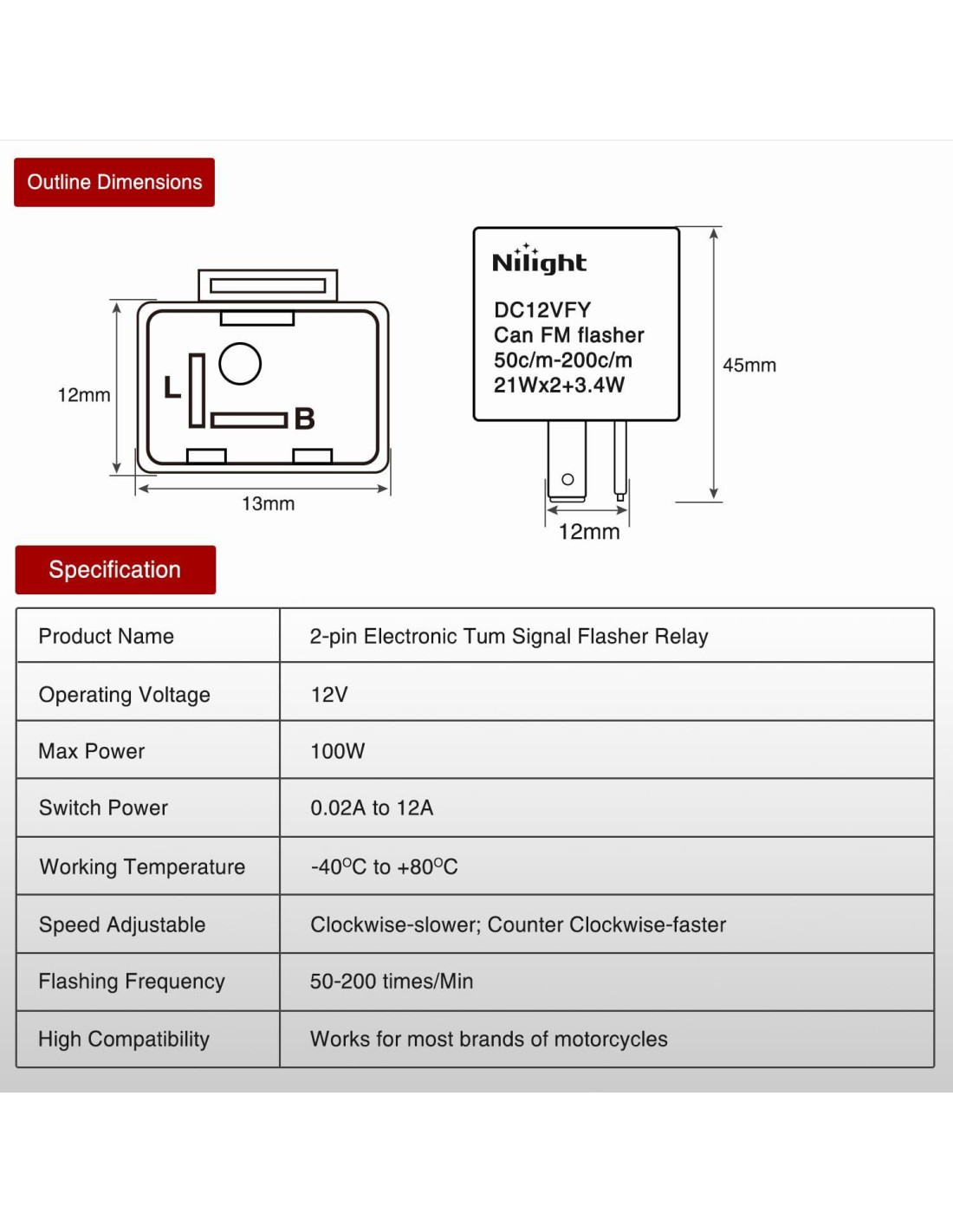 - Tipo: Relé de 2 Pines, Voltaje: 12V; Corriente: 0.02A a 12A; Frecuencia de parpadeo: 60-95 Veces/Min(+- 10 veces). NOTA: Por favor, verifica la dirección de los polos POSITIVO y NEGATIVO cuidadosamente para evitar comprar el producto incorrecto.