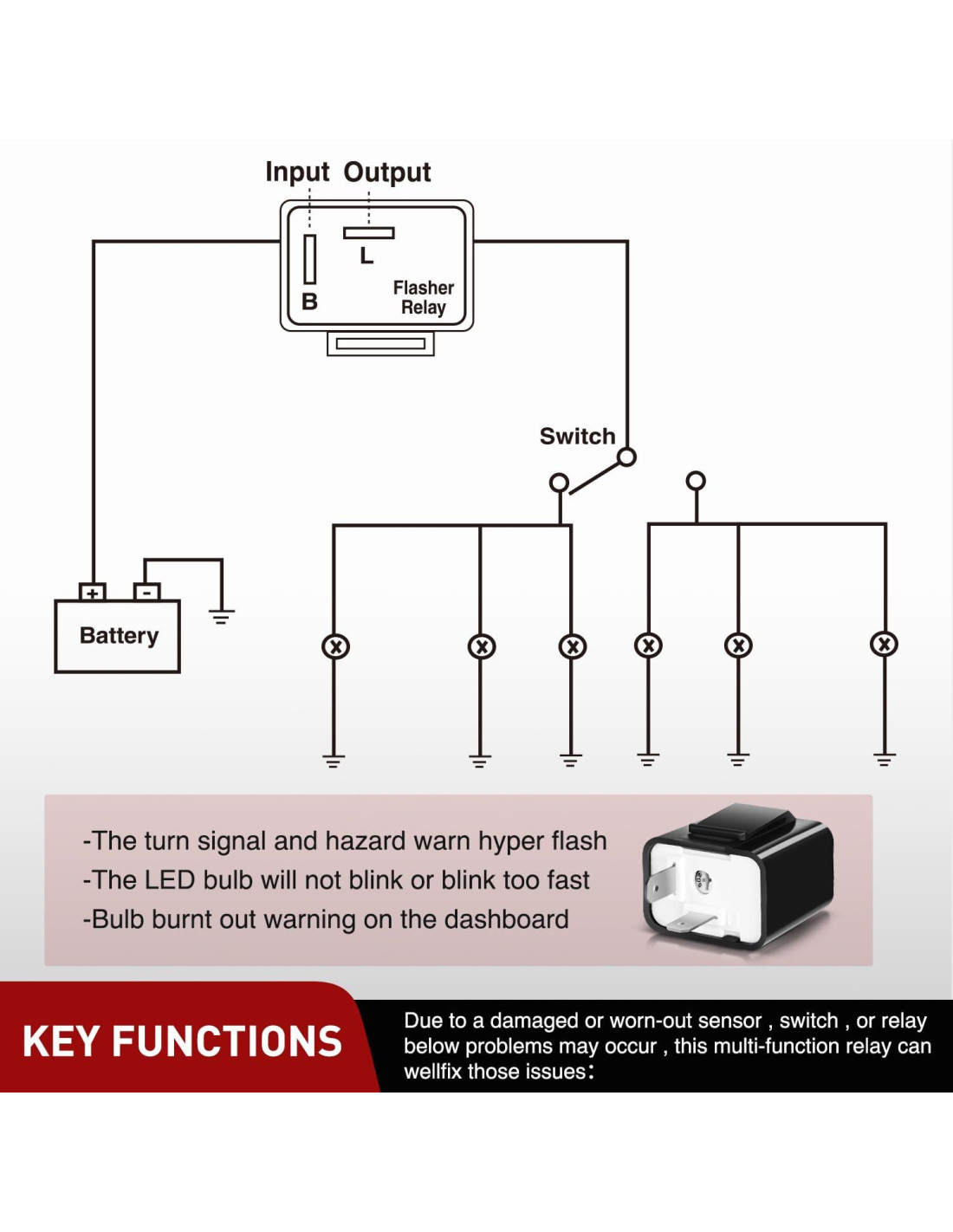 - Funciones Clave: Debido a un sensor, interruptor o relé dañado o desgastado, pueden ocurrir los siguientes problemas, este relé multifuncional puede solucionar bien esos problemas: El parpadeo hiper de la señal de giro y advertencia de peligro; La bombilla LED no parpadea o parpadea demasiado rápido; Advertencia de bombilla quemada en el tablero.
