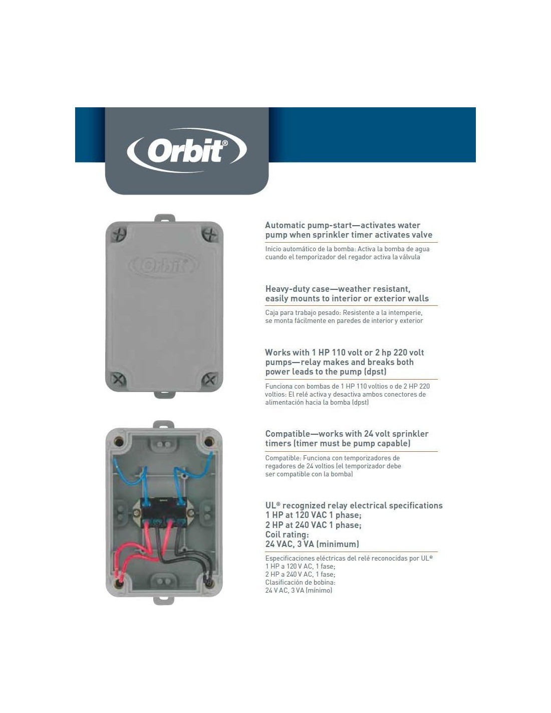 Descripción del Producto El relé de inicio de bomba está diseñado para sincronizar una bomba de irrigación con un controlador de irrigación/aspersor. Es efectivo para una variedad de fuentes de agua, incluyendo pozos, estanques y perforaciones. Los cables de 24 VAC conectan el controlador al relé. Es capaz de accionar bombas de 120 VAC de hasta 1 HP (0.75 kW) y bombas de 230 VAC de hasta 2 HP (1.5 kW). La carcasa está construida de plástico duradero y resistente al agua. El relé de inicio de bomba es compatible con controladores de irrigación de Orbit, Hydro-Rain y otras marcas importantes. Para uso en irrigación exterior con agua fría solamente. Del Fabricante El Relé de Inicio de Bomba sincroniza automáticamente su bomba para el riego con su temporizador de aspersor automático. Es compatible con sistemas de aspersores de 24 voltios y tiene una caja de plástico resistente a la intemperie para instalación exterior.