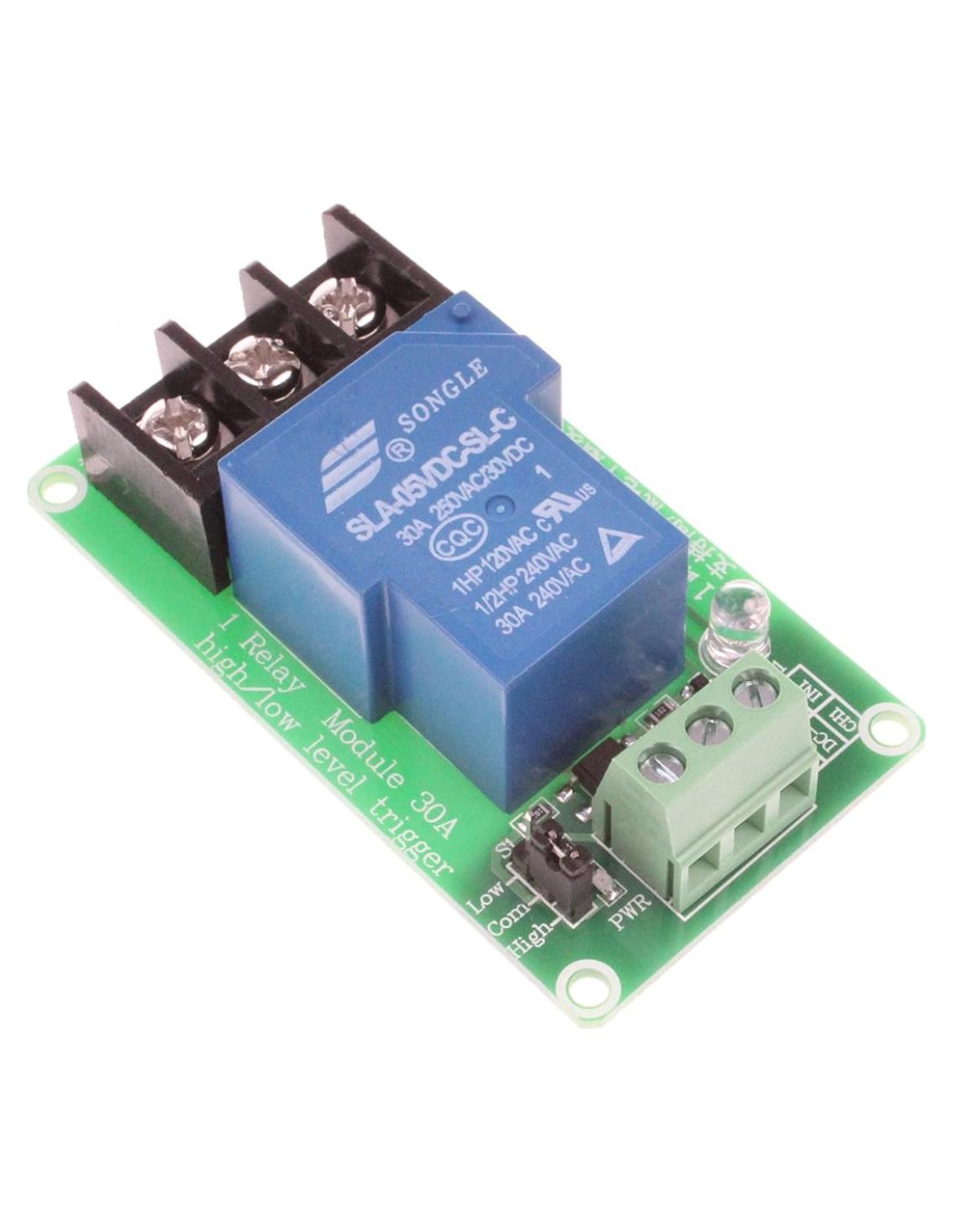 Parámetros eléctricos: Voltaje de suministro: DC5V; Corriente en reposo: 5mA; Corriente máxima de trabajo: 190mA; Modo de activación: Activación de Nivel Alto / Bajo; Voltaje de carga: DC 30V / AC 250V; Corriente de carga: 30A; Vida útil del módulo: 10 millones de veces; Frecuencia máxima de conmutación: < 5KHz; Peso del producto: 46g; Tamaño: 72x40x24mm (LxWxH); Tamaño del agujero de montaje: 44.5x27.5mm (LxW); Rango de voltaje de activación: Activación de nivel alto: DC 3.3-5V relé encendido; DC 0-2.5V relé apagado; ---- Activación de nivel bajo: DC 0-2V relé encendido; DC 3-5V relé apagado; Paquete incluido: 1 pieza Módulo de Relé de 1 Canal