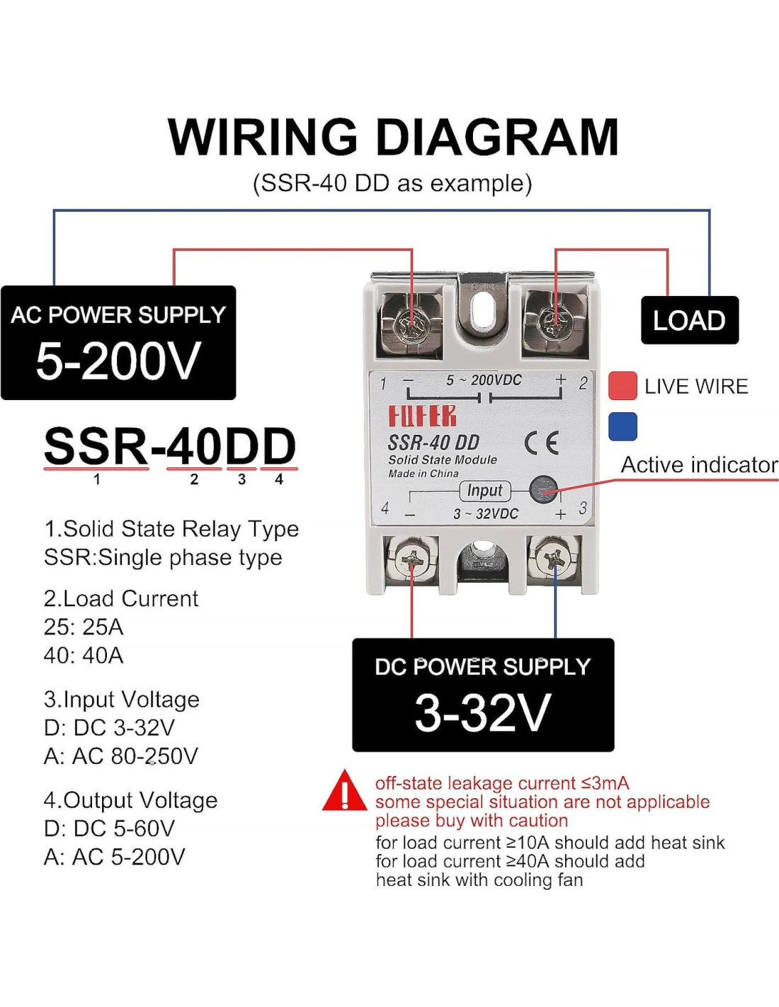 - Atención: relé SSR-25 DA 25A, si se usa en carga inductiva, tu corriente máxima es 10A. Se necesita agregar un gran disipador de calor o ventilador. Aplicar grasa térmica entre la placa base del relé de estado sólido y el radiador, y el ventilador se fuerza a enfriar si está por encima de 60A.