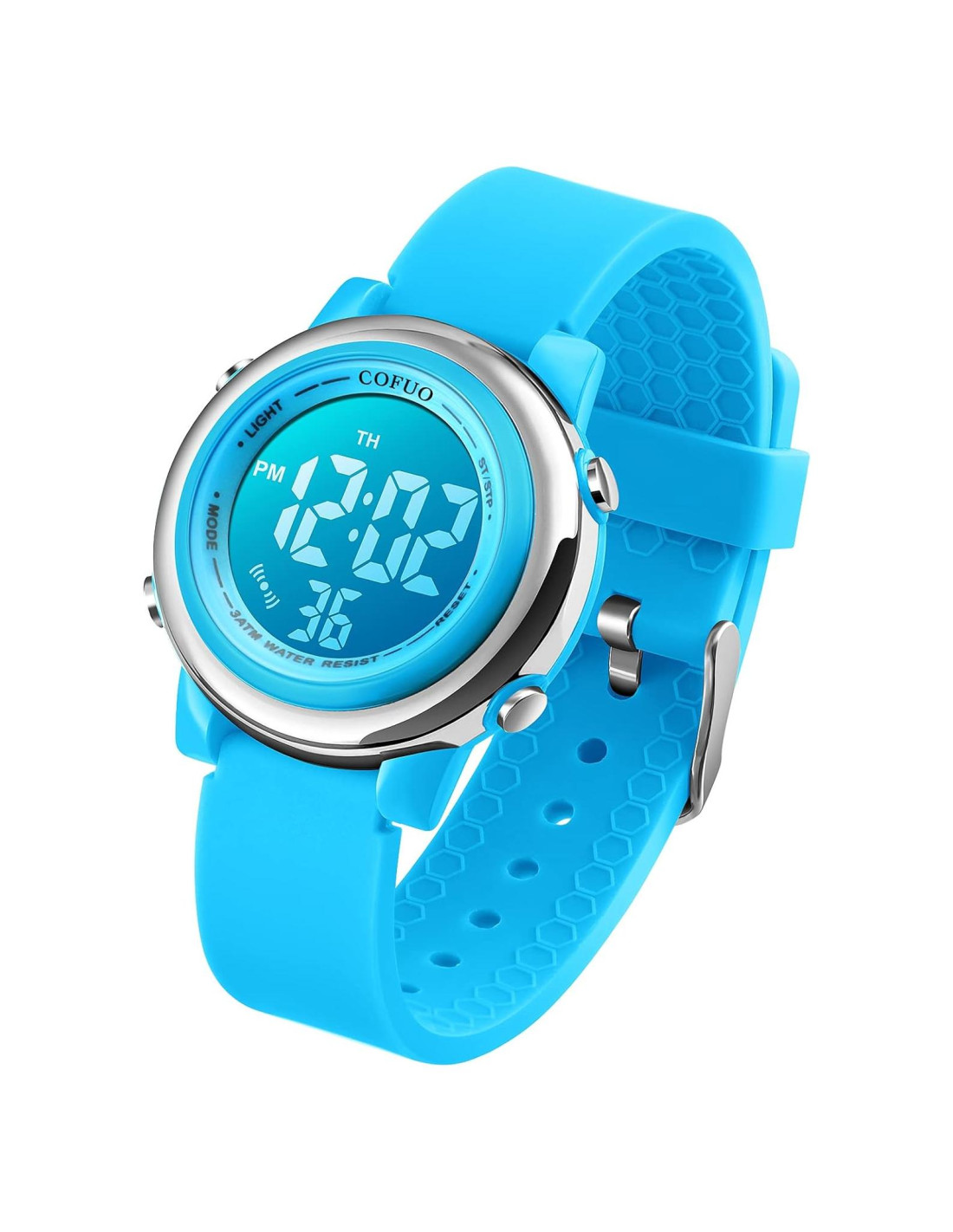 Destacados: Movimiento Original: Proporciona un mantenimiento del tiempo preciso y exacto Excelente material de PC para la caja y parte posterior de acero inoxidable Correa de silicona de alta calidad, vidrio de resina altamente transparente, no es fácil de desgastar Resistente al agua hasta 50M: Impermeable para uso diario, lavado de manos, ducha, natación, SIN Problema. (Por favor, NO PULSE el botón bajo el agua) MULTIFUNCIONAL: Calendario, Fecha, Semana, Mes, Alarma, Resistente al agua, Pantalla LED, Luz de fondo, Resistente a golpes, Cronómetro Luces LED: Usa luces LED coloridas, solo presiona el botón de luz de fondo a la izquierda, el niño puede ver claramente la hora por la noche. Material: Material de la caja: material de PC Material de la correa: silicona Superficie del espejo: vidrio de resina altamente transparente Especificación: Color de la esfera: Azul Diámetro de la caja de la esfera: 1.30 pulgadas (3.3 cm) Grosor de la caja de la esfera: 0.51 pulgadas (1.3 cm) Color de la correa: Azul Ancho de la correa: 0.71 pulgadas (1.8 cm) Longitud de la correa: 8.74 pulgadas (22.2 cm) Tipo de cierre de la correa: Hebilla Peso del reloj: 2.40 oz (68 g) **NOTA**: Por favor, NO PULSE el botón bajo el agua. Usar en temperaturas extremas de calor o frío acortará la vida del reloj. Si se encuentran niebla o gotas dentro de la superficie del reloj, comuníquese con el fabricante de inmediato. Se recomienda limpiar la correa con un paño suave de forma regular. Un contacto excesivo con el agua acortará la vida del reloj. ¿Qué hay en el paquete?: Reloj Deportivo al Aire Libre Cofuo con Correa de Silicona para Niños x 1