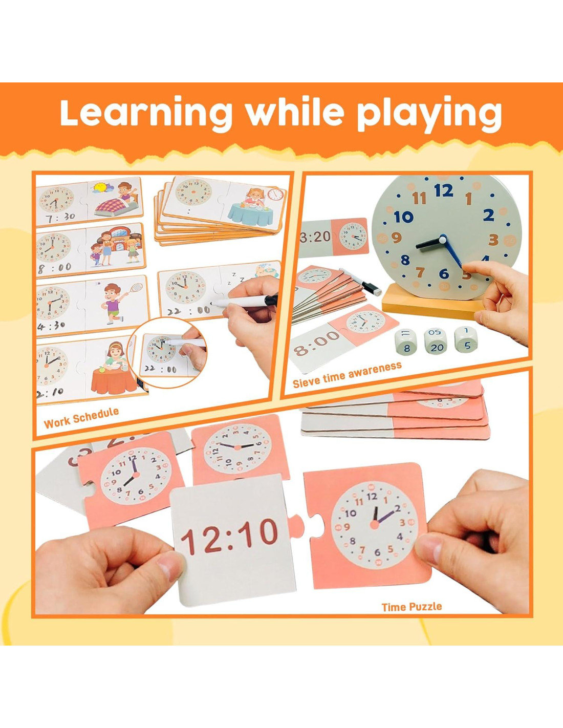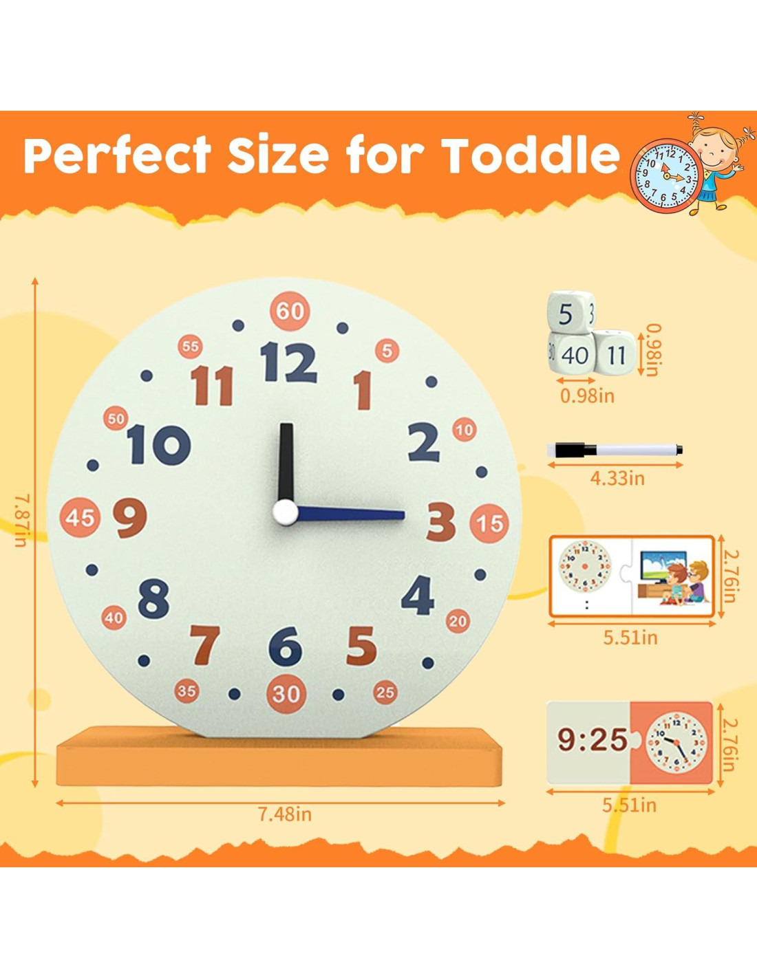 - [Lista de Empaque] : El conjunto de 16 piezas incluye un reloj de madera con manecillas móviles, 12 tarjetas de emparejamiento de números y tiempo de reloj, tarjetas de actividad diaria para escribir y borrar, 3 dados de tiempo más 1 bolígrafo borrable.
