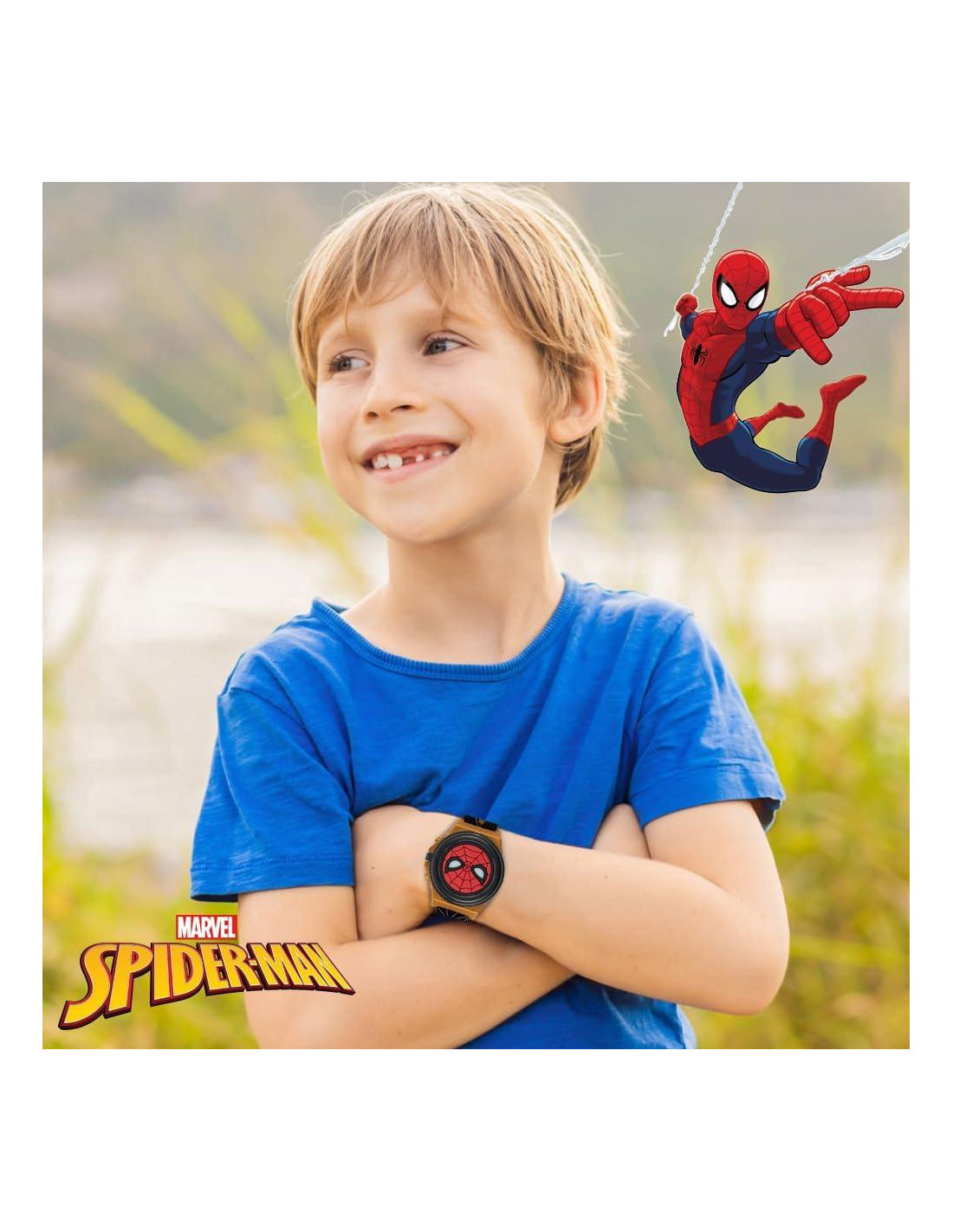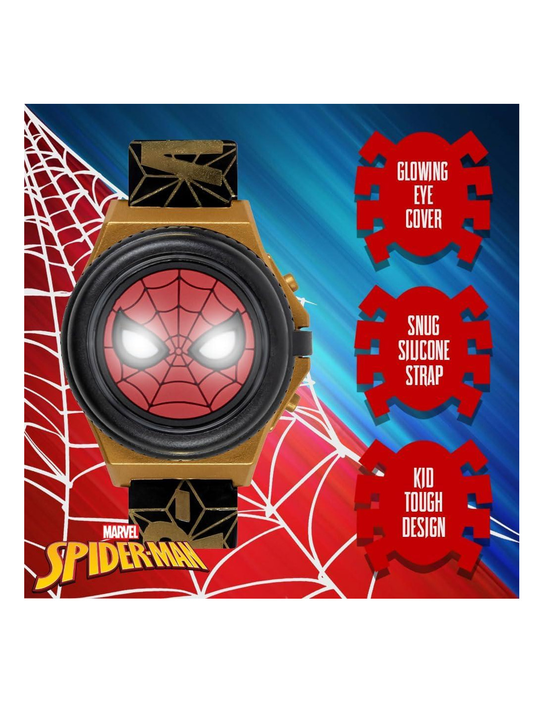 Deja que tu hijo se sumerja en la acción con el Reloj LCD de Tapa Abatible Brillante de Marvel Spider-Man. Diseñado con la icónica tapa de ojo brillante de Spider-Man, este reloj trae la emoción del Universo Marvel directamente a la muñeca de tu hijo. La tapa abatible iluminada añade un elemento interactivo que a los niños les encantará, mientras que la pantalla LCD asegura que puedan llevar un fácil control del tiempo. Construido con una duradera correa de silicona negra y en tonos dorados, este reloj es cómodo y resistente, perfecto para aventuras diarias. La correa ajustable se adapta a muñecas que miden de 14 cm a 20.3 cm (5.5" a 8"), proporcionando un ajuste seguro a medida que tu hijo crece. Empaquetado en una lata coleccionable con temática de Spider-Man, este reloj es el regalo definitivo para cumpleaños, festividades o cualquier ocasión especial. Deja que tu pequeño superhéroe brille con esta divertida y funcional pieza de tiempo.