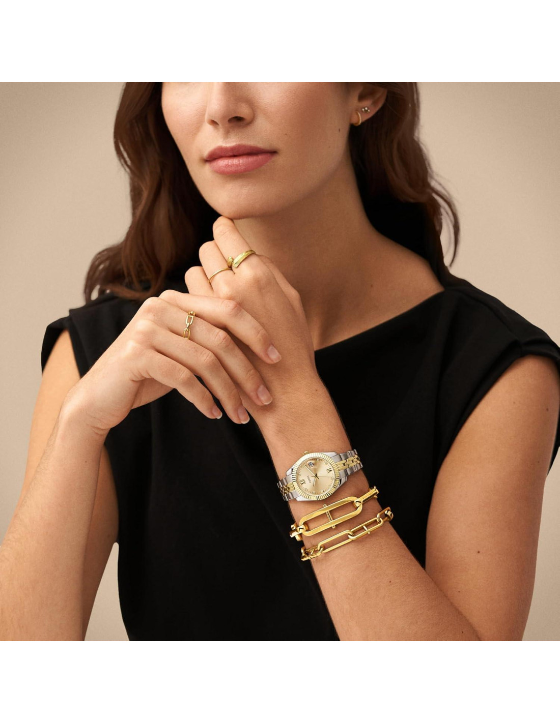 - Esfera: Caja redonda de acero inoxidable bicolor en plata y oro, con una esfera dorada con efecto de rayo de sol y acentos.