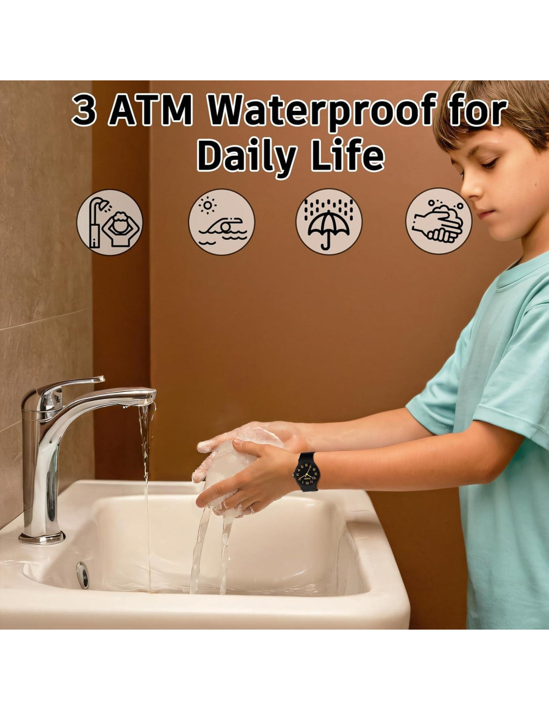 - Reloj Analógico Impermeable 3ATM para Niños: Impermeable para la vida, se puede lavar las manos, salpicar, llover, etc., pero no se puede usar a alta temperatura, y no se puede sacar la perilla en el agua.