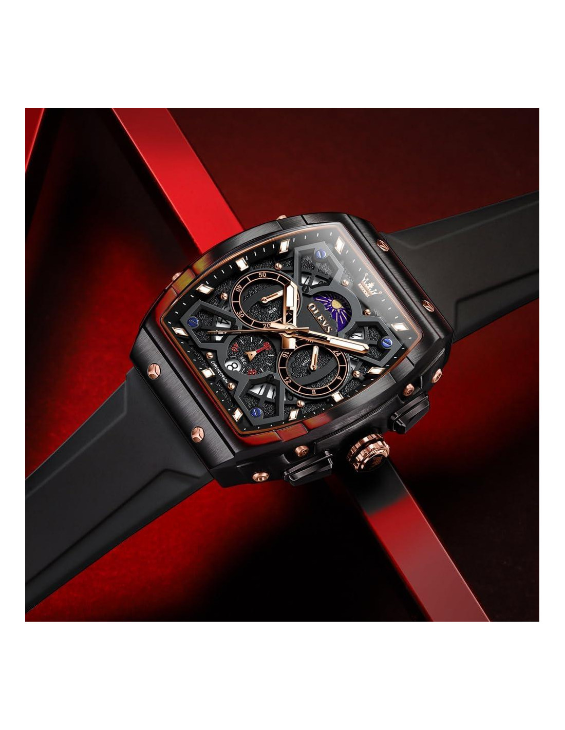 - RELOJ DE HOMBRE DISEÑO ÚNICO: Reloj de hombre estiloso con forma de tonel y diseño de fase lunar con cara grande y múltiples opciones de color para elegir. El diseño de la correa de silicona combina perfectamente el deporte y el ocio, adecuado para muchas escenas interiores y exteriores.