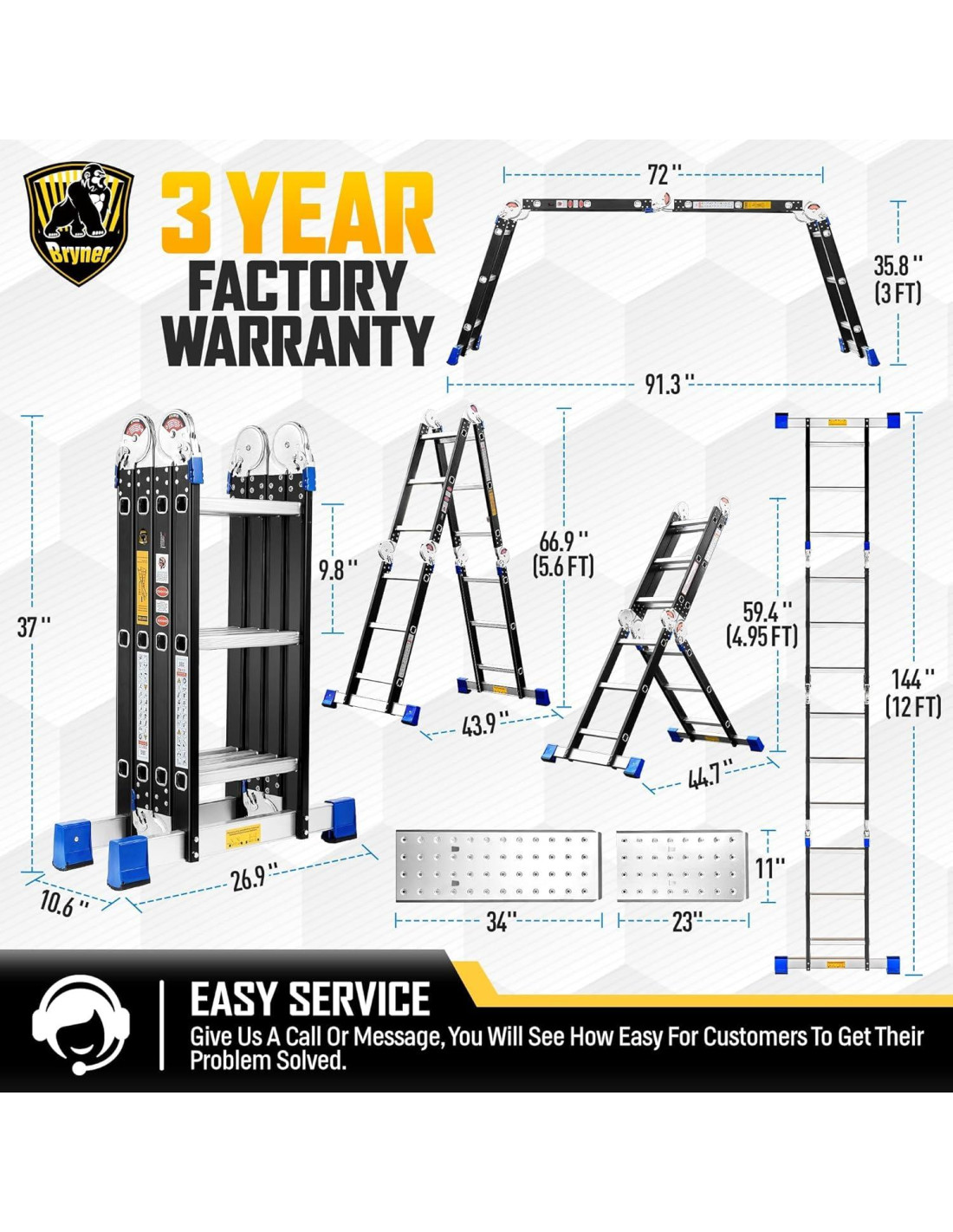 - SERVICIO SIN COMPLICACIONES La escalera multiusos BRYNER 7 en 1 proporciona una versatilidad inigualable, permitiéndole abordar cualquier tarea en el hogar con facilidad. Ofrecemos una garantía de fábrica de 3 años y atención al cliente en EE. UU. Si tiene alguna pregunta, no dude en contactarnos. Garantizamos que tendrá una gran experiencia.