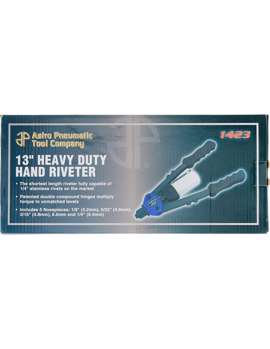 Descripción del Producto La remachadora manual de alta resistencia Astro Pneumatic 1423 de 13 pulgadas es ideal para trabajar en áreas de difícil acceso. Es una de las remachadoras manuales más versátiles y potentes, eliminando el trabajo duro de colocar remaches ciegos de gran diámetro con un mecanismo interno de engranaje patentado. Un cuerpo de casquillo de una sola pieza elimina la necesidad de ajustar la herramienta al cambiar los diámetros de los remaches. Incluye 5 boquillas: 1/8-pulgada (3.2mm), 5/32-pulgada (4.0mm), 3/16-pulgada (4.8mm), 1/5-pulgada (5.1mm) y 1/4-pulgada (6.4mm). Desde el Fabricante La remachadora manual de alta resistencia Astro Pneumatic 1423 de 13 pulgadas es ideal para trabajar en áreas de difícil acceso. Es una de las remachadoras manuales más versátiles y potentes, eliminando el trabajo duro de colocar remaches ciegos de gran diámetro con un mecanismo interno de engranaje patentado. Un cuerpo de casquillo de una sola pieza elimina la necesidad de ajustar la herramienta al cambiar los diámetros de los remaches. Incluye 5 boquillas: 1/8-pulgada (3.2mm), 5/32-pulgada (4.0mm), 3/16-pulgada (4.8mm), 1/5-pulgada (5.1mm) y 1/4-pulgada (6.4mm).