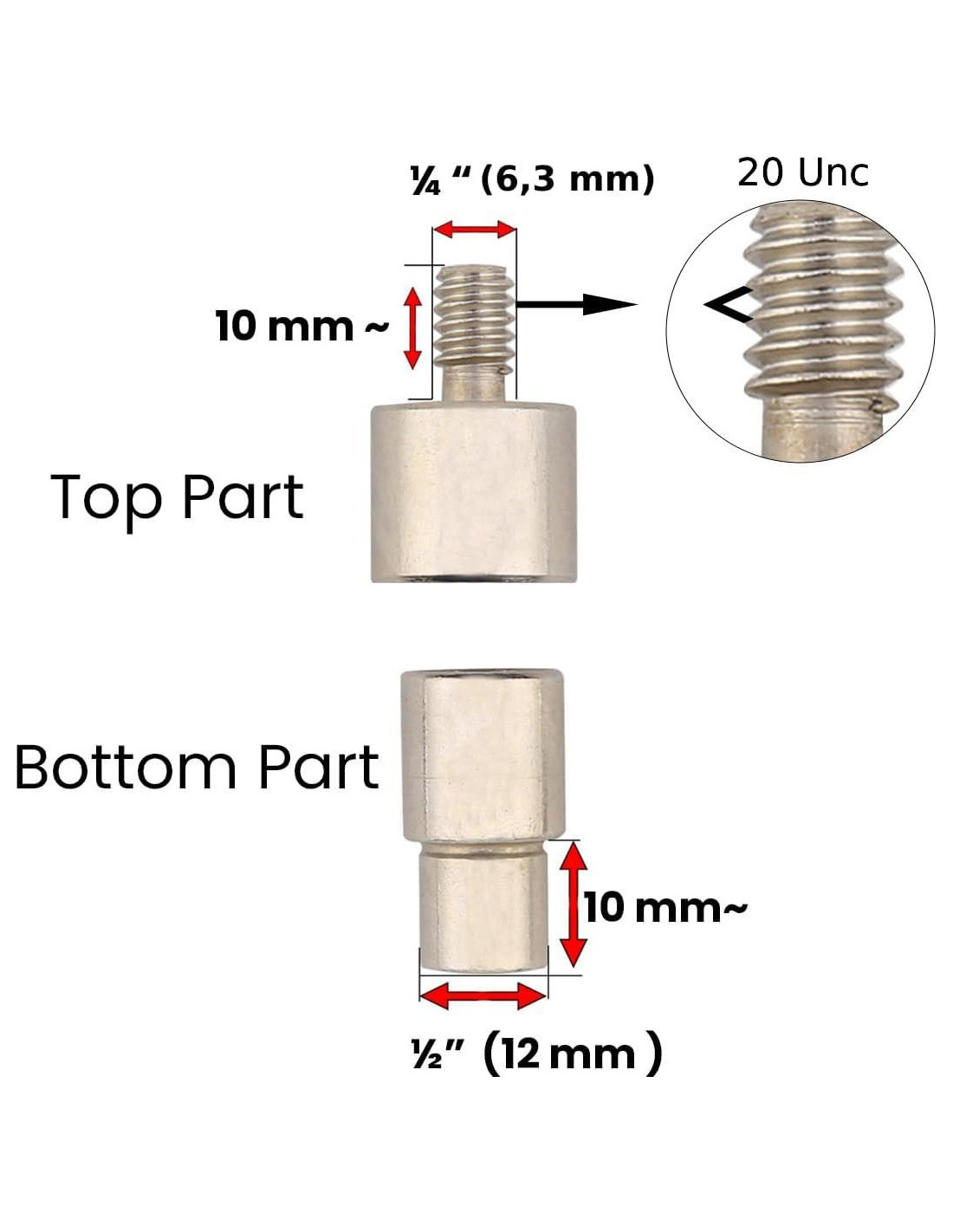 - Esta lista es solo para troqueles. Los remaches y la máquina de prensa no están incluidos. Y los troqueles no se pueden usar sin la máquina. El diámetro de la rosca superior del troquel es de 1/4 pulgada (6,3 mm) y el tamaño del diámetro de la ranura del troquel inferior es de 1/2 pulgada (12 mm).