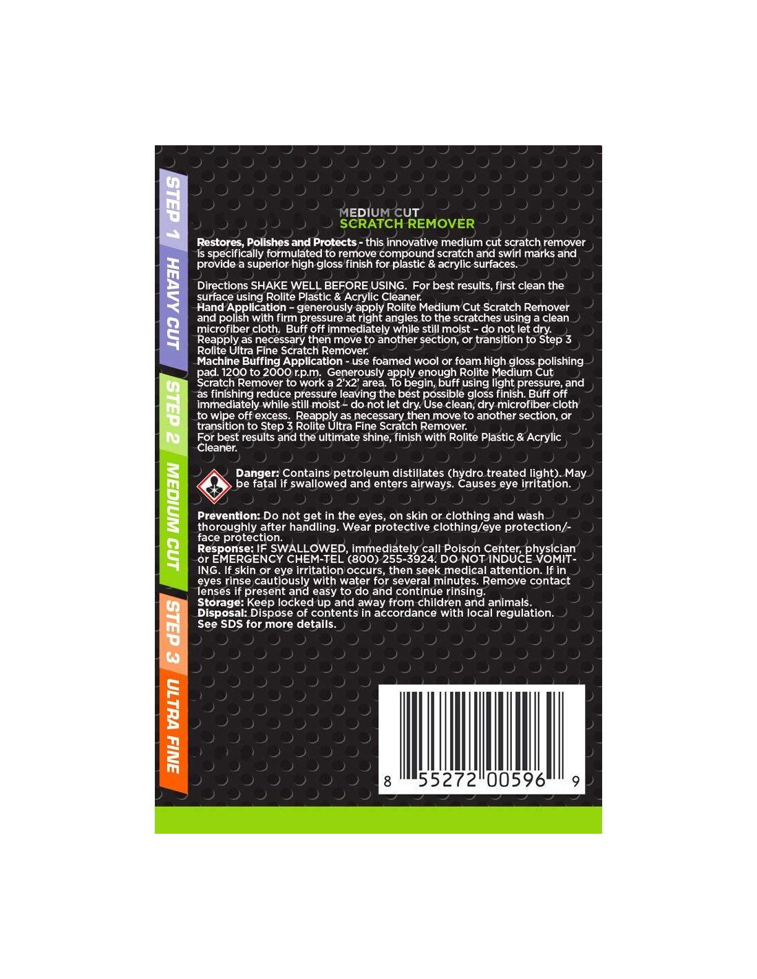 Nuestro conveniente set de eliminación de rayones de 3 pasos es rápido y fácil de usar, y viene con 3 fórmulas especiales para arreglar rayones finos, medianos y profundos. Nuestro kit de eliminación de rayones se puede usar para pulir y abrillantar superficies de plástico o acrílico rayadas, y funciona muy bien en autos, ventanas de plexiglás, laptops, computadoras, pantallas de TV o teléfonos celulares, acuarios, exhibiciones antiguas y otras superficies de plástico. Nuestro Removedor de Rayones de Corte Pesado es el removedor de rayones de corte pesado definitivo, formulado específicamente para eliminar rayones P1200 y más finos, incluyendo marcas de abrasión y proporcionar un acabado brillante superior. Nuestro Removedor de Rayones de Corte Medio está diseñado para pulir rayones de corte medio y está formulado específicamente para eliminar marcas de rayones y torbellinos compuestos y proporcionar un recubrimiento brillante superior. Nuestro Removedor de Rayones Ultra Fino proporciona un acabado ultra fino y está formulado para eliminar marcas de rayones y torbellinos de microacabado y proporcionar un acabado suave y brillante. Rolite es uno de los principales diseñadores, fabricantes y comercializadores de productos de pulido profesional en las industrias automotriz, marina, aviación, motocicletas, vehículos recreativos, comercial, doméstica, joyería y antigüedades. Tenga en cuenta que siempre hay rayones que pueden ser demasiado profundos para eliminar y están más allá de la reparación, incluso con un removedor de rayones efectivo como este producto. En ese caso, recomendamos probar con este producto primero y si no ve resultados, considere una segunda aplicación. Si nuevamente los rayones no se eliminan, puede que desee considerar reemplazar el producto dañado. Establecida en 1976, el laboratorio de la compañía Rolite es una instalación de investigación de vanguardia dedicada a ofrecer productos de calidad superior que crean un brillo brillante. Diseñamos, fabricamos y empaquetamos todos nuestros productos internamente a partir de fórmulas que hemos desarrollado. Debido a que seguimos siendo un negocio familiar, tenemos la capacidad única de mantenernos en estrecho contacto con las solicitudes de nuestros clientes y brindarle el mejor servicio al cliente que se merece.