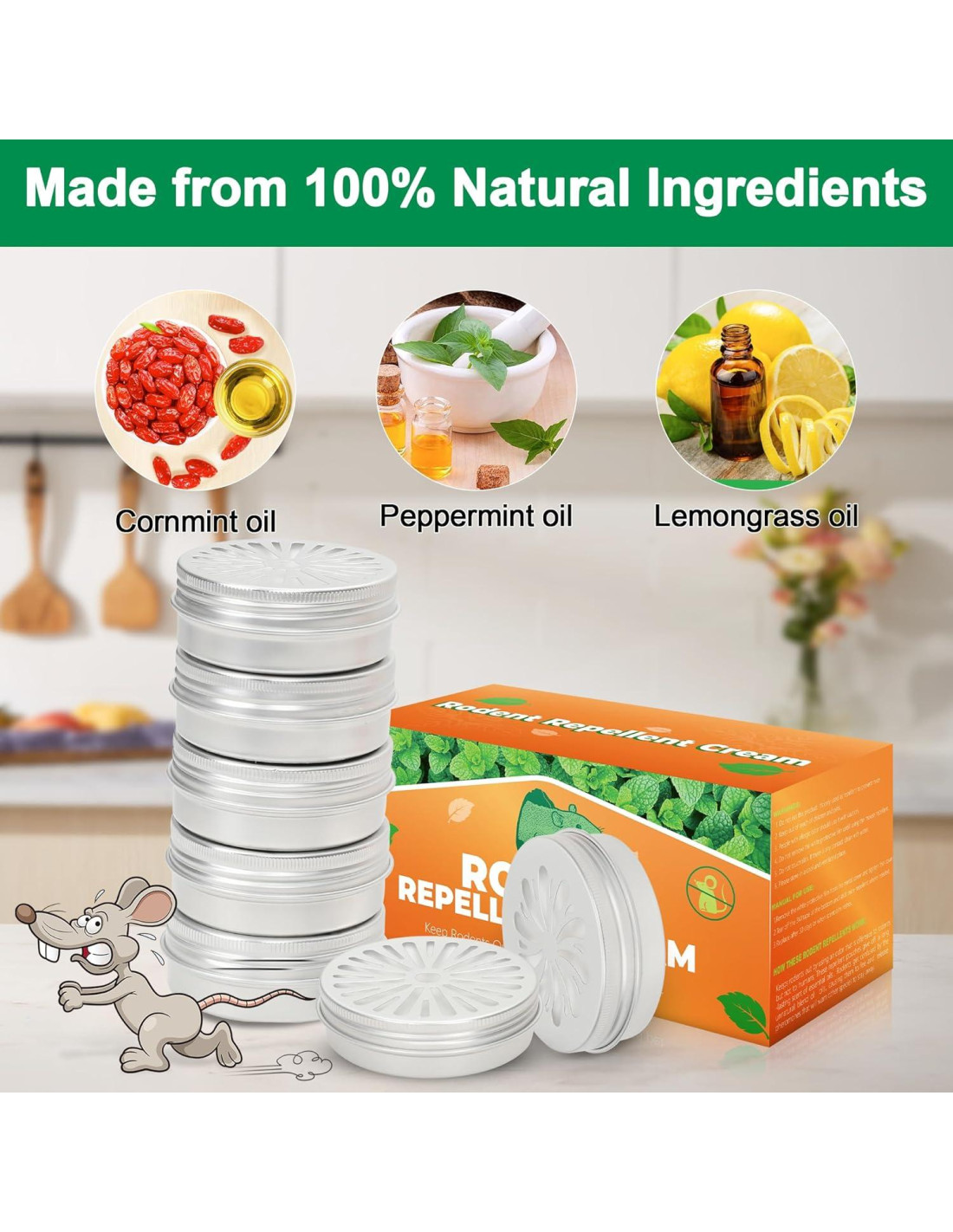 - Repelente de Ratones Efectivo y Natural: Los repelentes de ratas al aire libre están hechos de ingredientes naturales de aceite de menta que emitirán un aroma comprobado para ahuyentar a los ratones, ratas y otros roedores creando un ambiente desagradable.