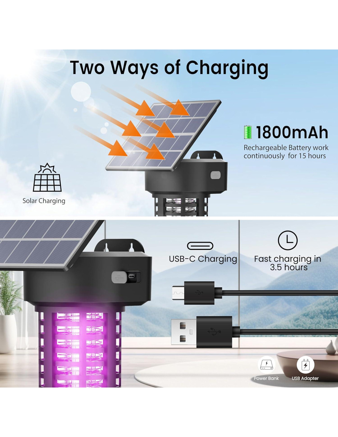 - [Alimentado por Solar y Carga USB-C] Nuestro zapper de mosquitos exterior se puede cargar mediante el panel solar en la parte superior y está equipado con una batería recargable de 1800mAh. También se puede cargar rápidamente a través del cable tipo C en 3.5 horas y funcionar durante 15 horas cuando está completamente cargado. Grado de impermeabilidad IPX4, puede manejar fácilmente el mal tiempo exterior.