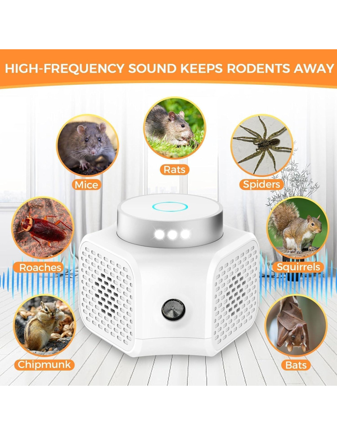 Nuestro Repelente de Plagas Ultrasónico es la solución definitiva para proteger su hogar contra roedores y diversas plagas. Utilizando tecnología de ondas ultrasónicas de vanguardia, este dispositivo actúa como un disuasivo altamente efectivo, asegurando que las plagas no deseadas se mantengan alejadas de su espacio vital de manera humanitaria. Repelente Ultrasónico de Roedores*1; Cable de Alimentación*1 (119.38 cm); Manual del Usuario*1 NOTA: Este repelente de plagas ultrasónico es solo para uso en interiores. No lo coloque al aire libre, en lugares cálidos o húmedos. La luz azul está encendida. Esta configuración simula los sonidos que los roedores escuchan. Los humanos oirán el sonido agudo del modo de prueba. -La luz azul está encendida. La conversión de frecuencia ultrasónica de 22-35kHz comienza a funcionar normalmente. -La luz verde está encendida. La frecuencia ultrasónica sólida de 25kHz comienza a funcionar normalmente. -Ambas ondas ultrasónicas funcionan al mismo tiempo, y los indicadores azul y verde se iluminan al mismo tiempo. Produce un sonido constante de "DUO DUO DUO" y no se recomienda para uso nocturno. Antes de usar, roedores como ratones y ardillas deambularán por su ático, garaje, granero o casa rodante, mordisqueando madera y robando comida en su hogar. Durante la primera semana, los roedores se vieron afectados y se volvieron inquietos o nerviosos. Durante la segunda semana, los roedores huirán de donde colocó el repelente debido a los ultrasonidos insoportables y las luces estroboscópicas. Para las semanas 3-4, los roedores casi habían desaparecido. Este repelente de plagas ultrasónico es no tóxico, no tiene radiación, no contiene productos químicos dañinos, no tiene olor, es 100% seguro para humanos y mascotas. El repelente ultrasónico de roedores enchufable de amplio alcance proporciona protección integral para todo su hogar, creando un ambiente libre de plagas. Este repelente de plagas ultrasónico es no tóxico, no tiene radiación, no contiene productos químicos dañinos, no tiene olor, es 100% seguro para humanos y mascotas.