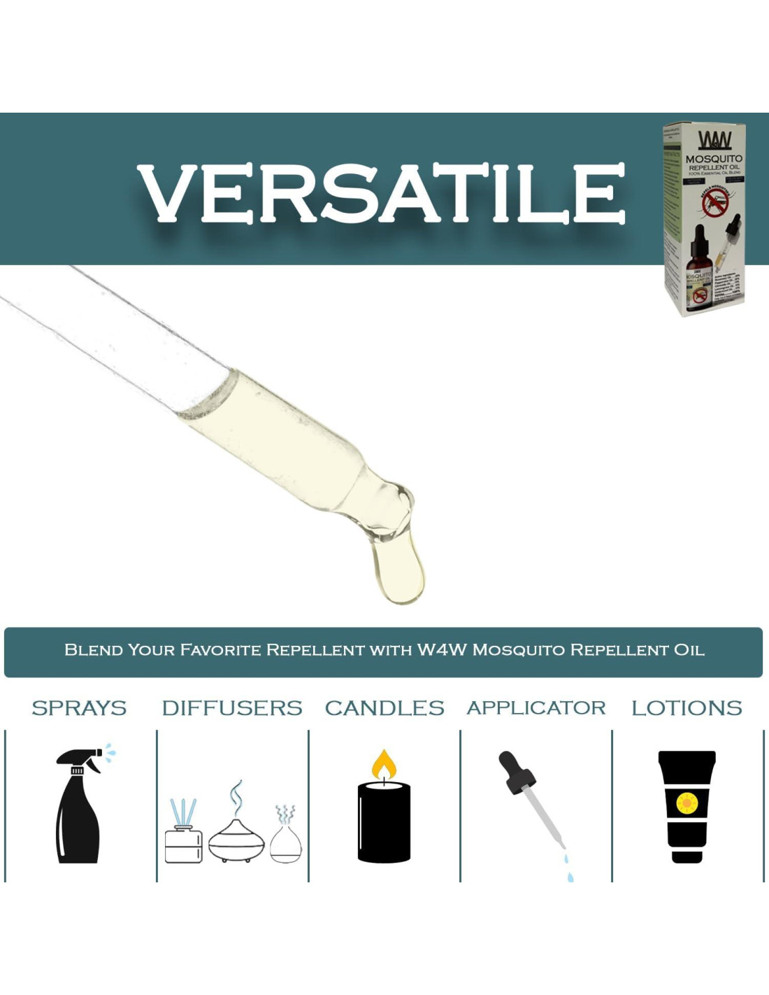 - Nuestra Mezcla de Aceites Esenciales para Mosquitos está elaborada utilizando 100% Aceites Esenciales Naturales. Usamos la misma fórmula probada que nuestros Carburos W4W para exteriores para asegurar la máxima efectividad. Trabajamos con nuestro laboratorio para licuar nuestra fórmula patentada y ahora puede ser utilizada en interiores y exteriores con Difusores Eléctricos y de Cerámica, Diluidos como Aerosol, y usados como base para Lociones y Velas.