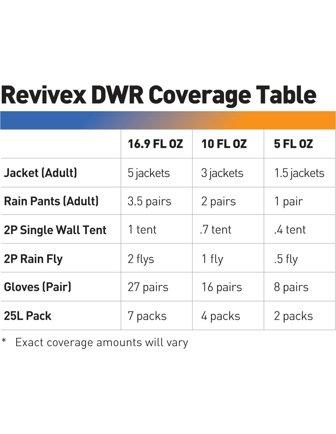 - Para un mejor rendimiento, lava primero con Revivex Pro Cleaner antes de aplicar el Spray Repelente de Agua Durable (DWR). El empaque puede variar.