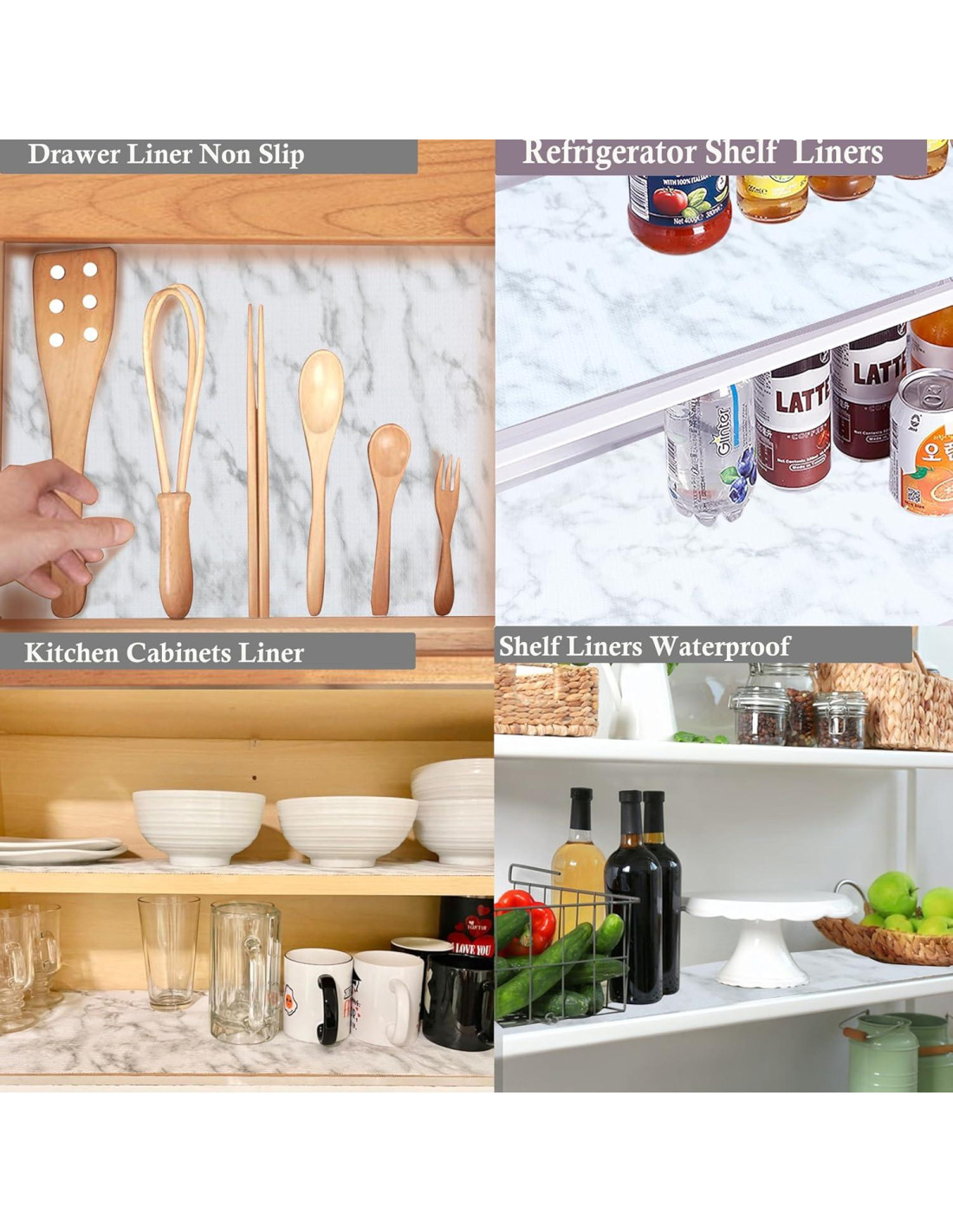 - MATERIAL DE ALTA CALIDAD - Los forros de estante están hechos de material de grado alimenticio de alta calidad sin olor químico a plástico, pueden entrar en contacto directamente con frutas y otros alimentos. Con el patrón de mármol impreso, pueden combinar perfectamente con la decoración de tu cocina. Bien hechos, pueden colocarse planos en los gabinetes sin enrollarse.