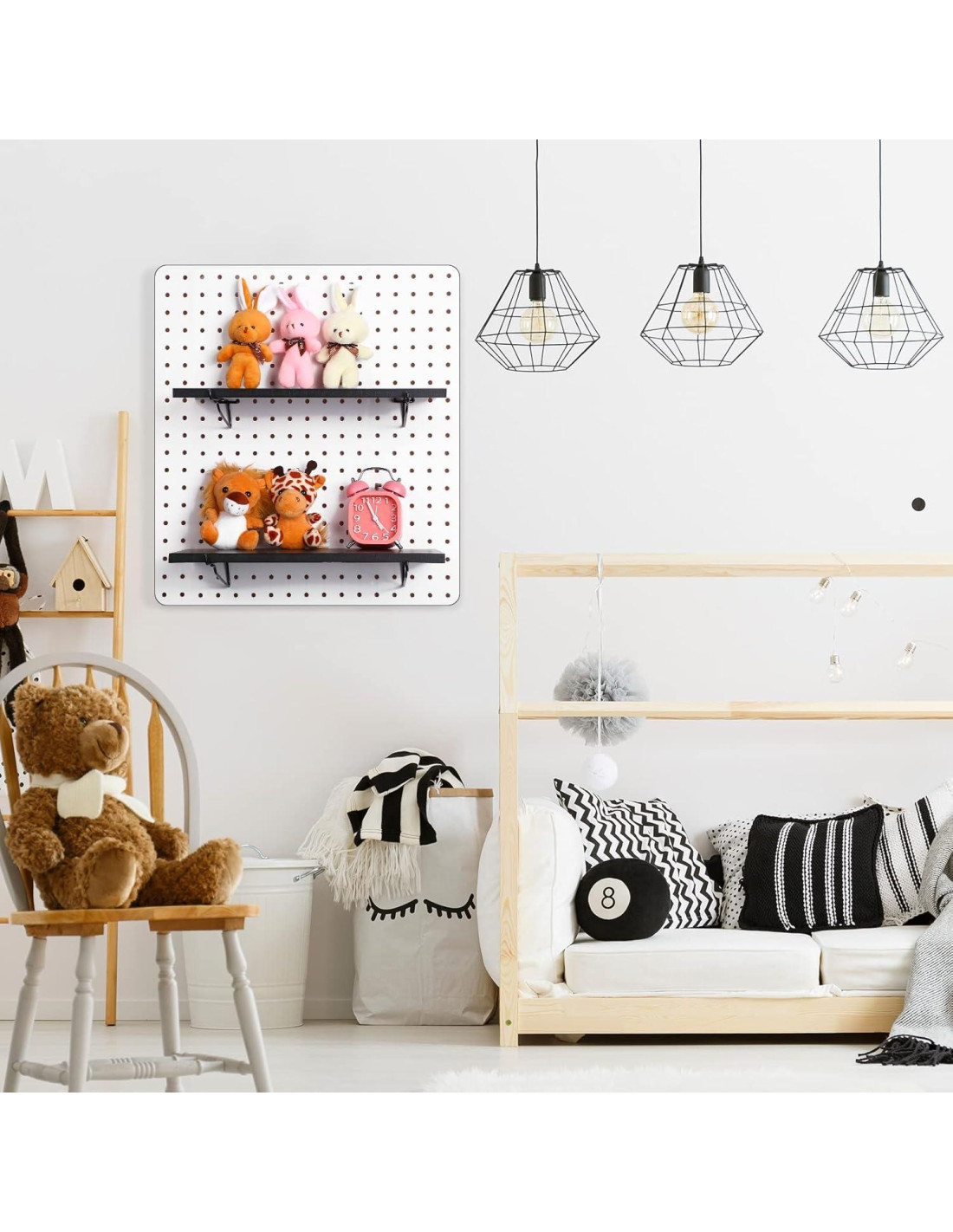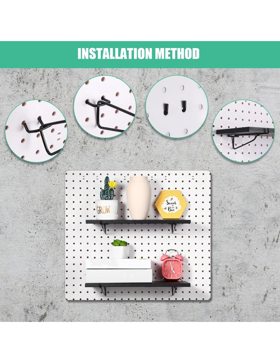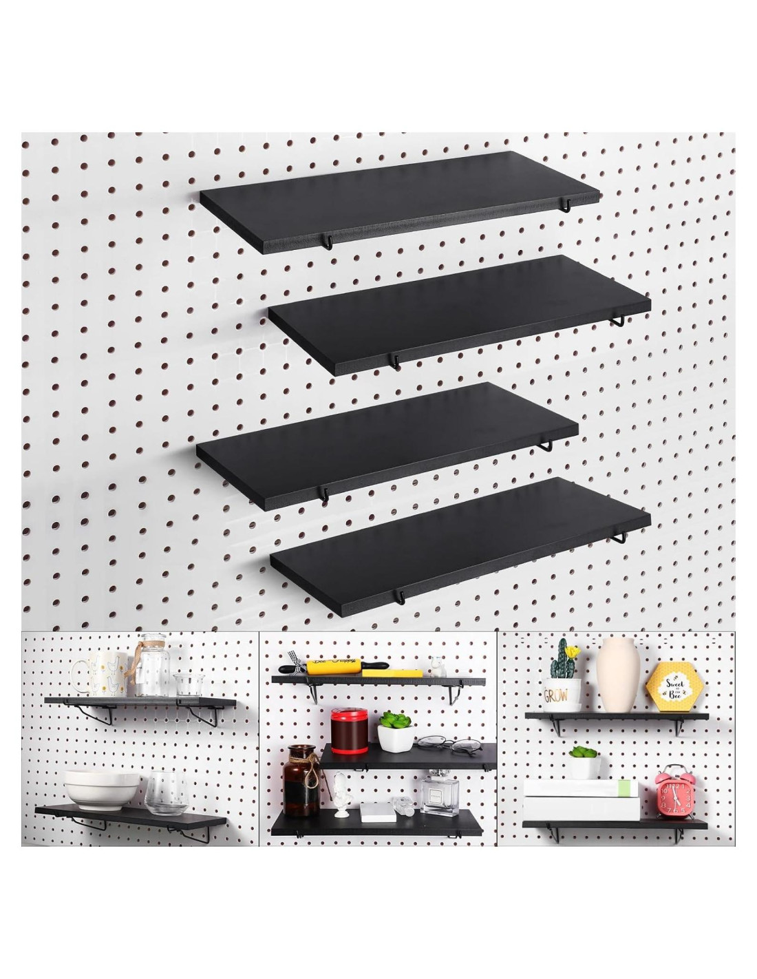 - Amplia gama de usos: los estantes de pared de tablero perforado son adecuados para colocar pequeños adornos de manualidades, pequeñas plantas suculentas, tazas e incluso pequeñas cajas de almacenamiento de piezas, herramientas y más, para que tu pared luzca ordenada y hermosa