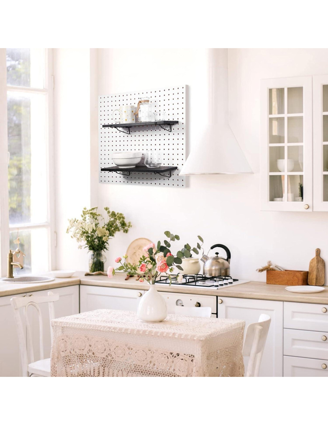 - Recordatorio: recibirás 4 piezas de estantes de tablero perforado y 8 piezas de ganchos; Los productos terminados de nuestros tableros perforados están hechos de madera; Para mantener la veta original, el papel está pintado con pintura ligera, por lo que algunos productos pueden aparecer de color púrpura claro bajo la luz