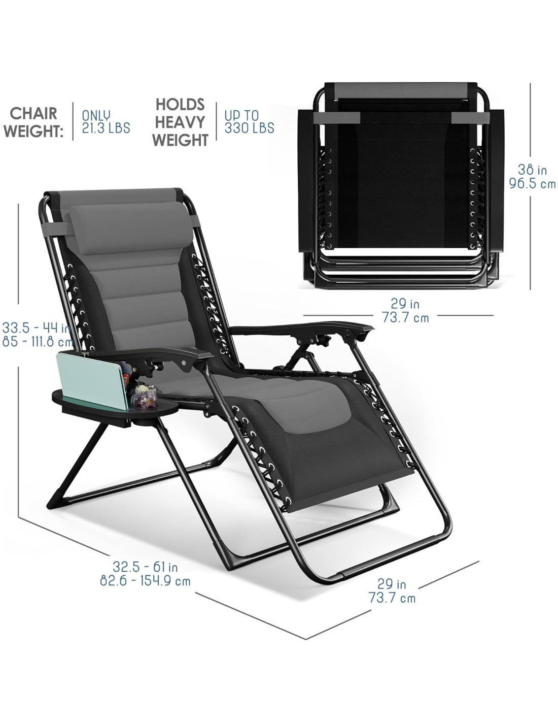 - Silla de gravedad cero acolchada: Las sillas de gravedad cero extra anchas transicionan sin esfuerzo de erguida a completamente reclinada, con un deslizamiento suave que responde al peso de tu cuerpo. El respaldo y el reposapiés ajustables se bloquean de forma segura en tu ángulo preferido para una posición ingrávida y relajante que apoya tu espalda.