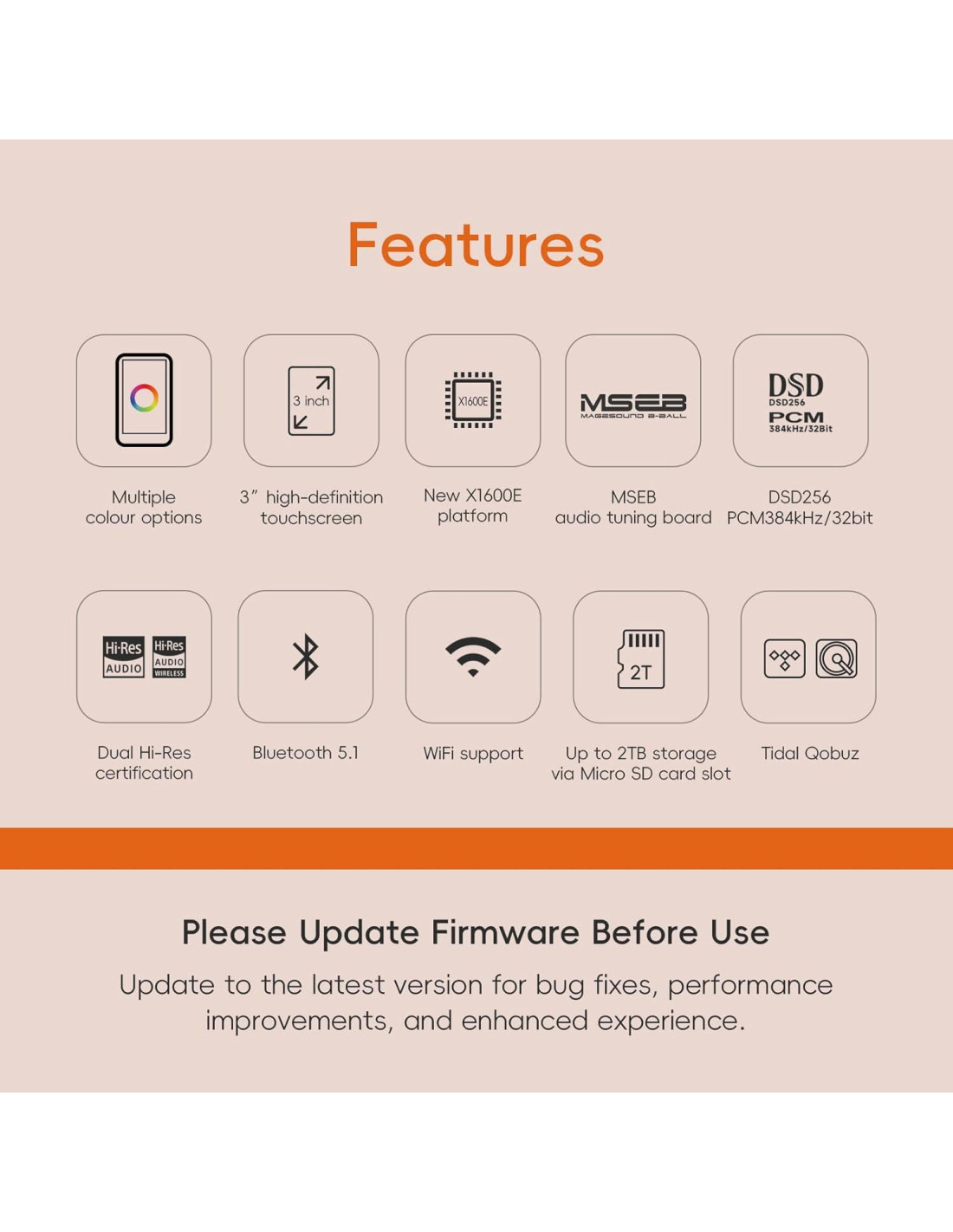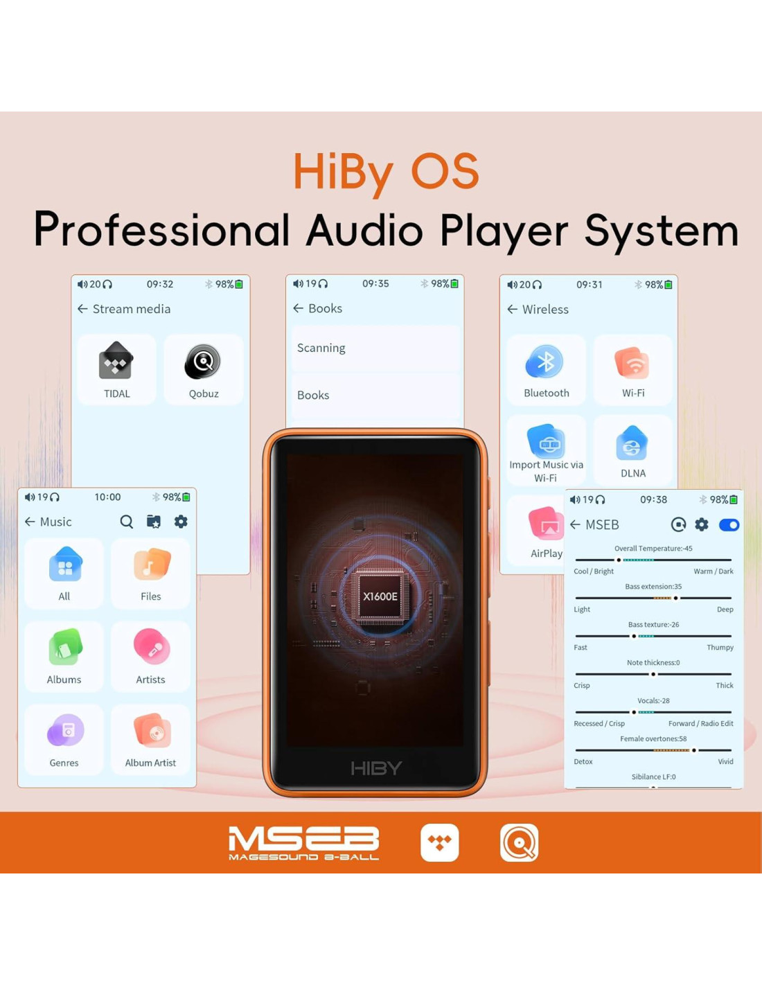 - Reproductor MP3 suave y potente, impulsado por la CPU X1600E y funcionando en HiByOS, este reproductor MP3 ofrece una experiencia fluida con una estabilidad de Bluetooth mejorada. Soporta streaming de Tidal y Qobuz (solo en línea) y reproducción de radio por internet, mientras que el mezclador MSEB integrado permite una afinación de sonido personalizada. Perfecto para audiófilos, combina un rendimiento profesional con características amigables para el usuario para una experiencia de escucha excepcional.