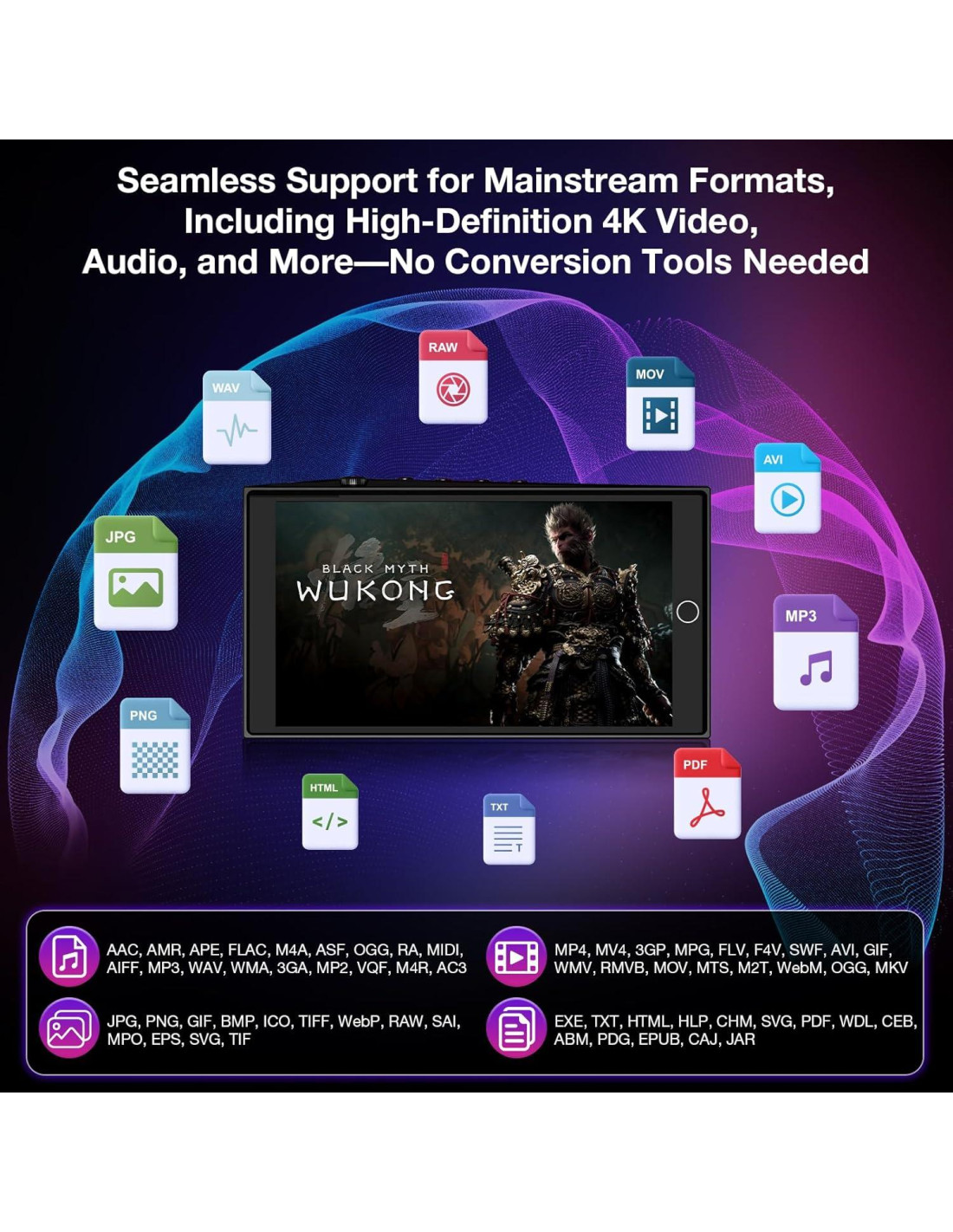 - [Almacenamiento Expandible Masivo] Con 64GB de almacenamiento incorporado más una tarjeta de 128GB, expandible hasta 1TB, este reproductor Mp3 transmisor Bluetooth ofrece amplio espacio para tus medios. Almacena miles de archivos de audio de alta calidad, películas 4K y libros electrónicos. Perfecto para audiófilos y entusiastas de los medios, te permite construir una vasta biblioteca de entretenimiento personal. Disfruta de audio sin pérdida y video 4K sin preocupaciones de almacenamiento.
