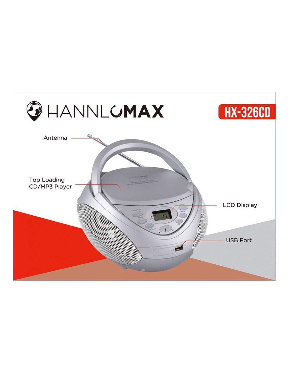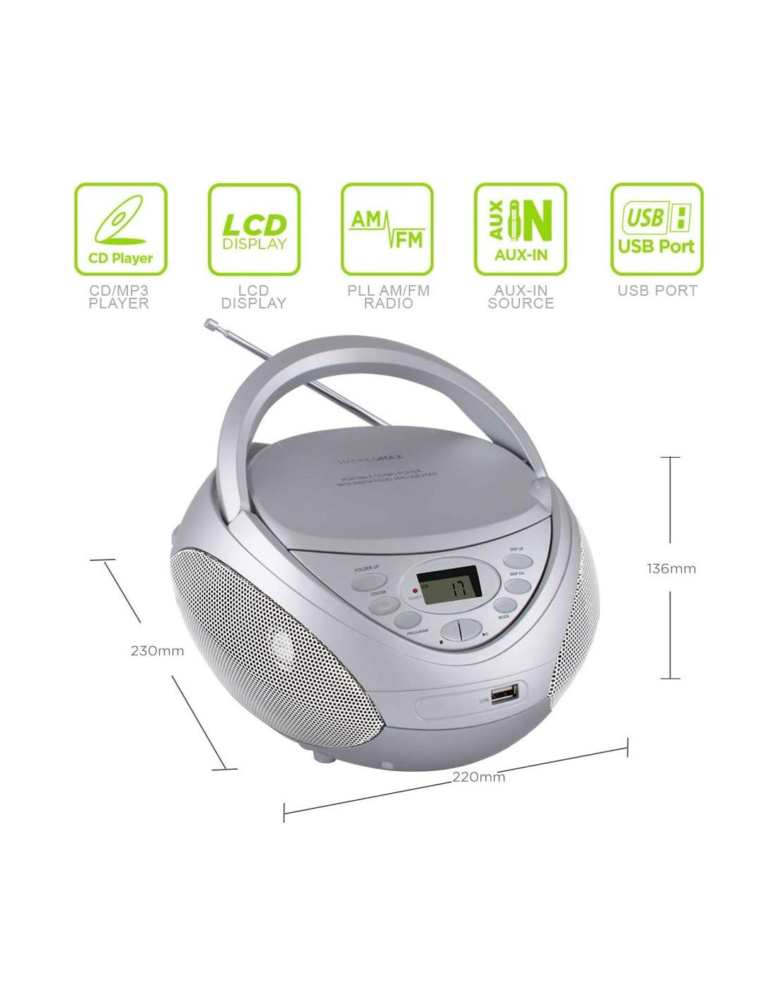 - Reproductor CD/MP3 Portátil con USB: Soporta CD/CDR/CDRW/MP3. Además, reproduce tu música MP3 favorita en una memoria USB a través del puerto USB